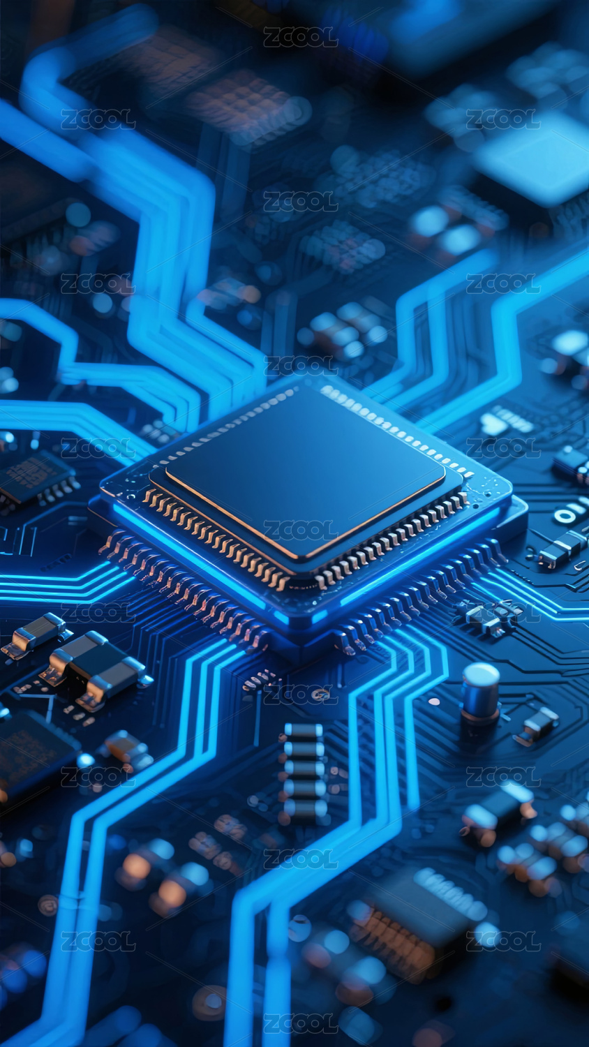 科技,芯片,电路,精密,电子,元件,冷色,深蓝,银灰,中心