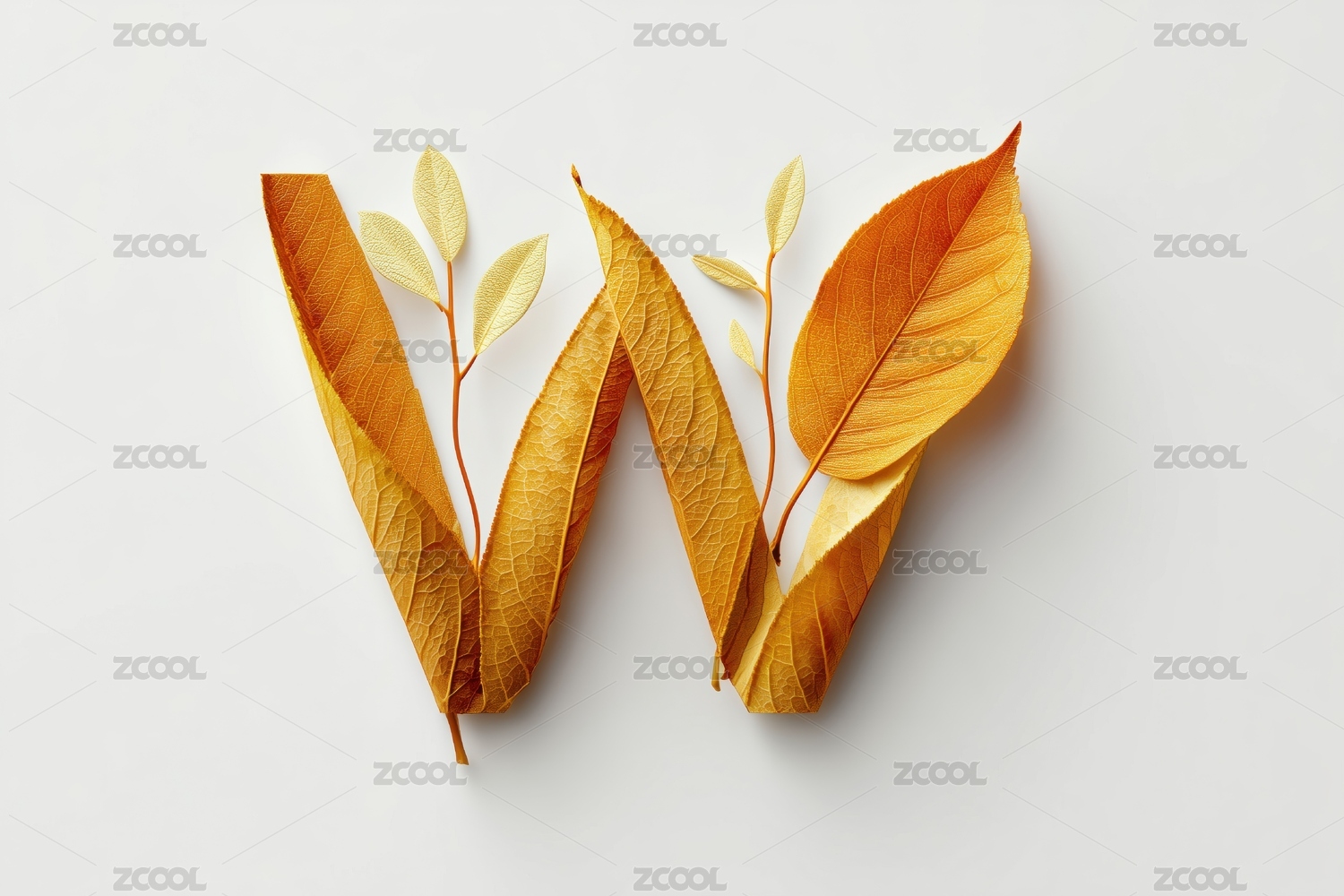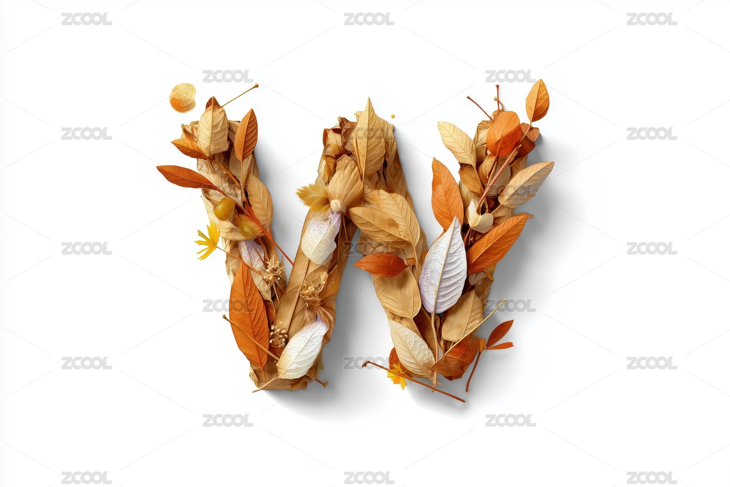 秋天枯黄树叶的英文大写字母W图案扁平背景