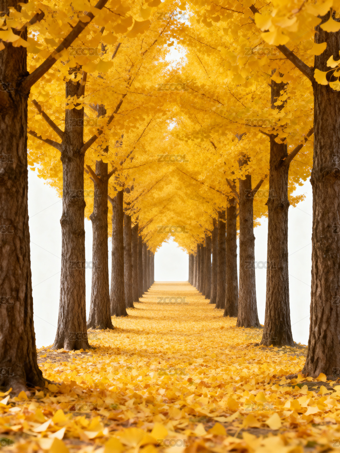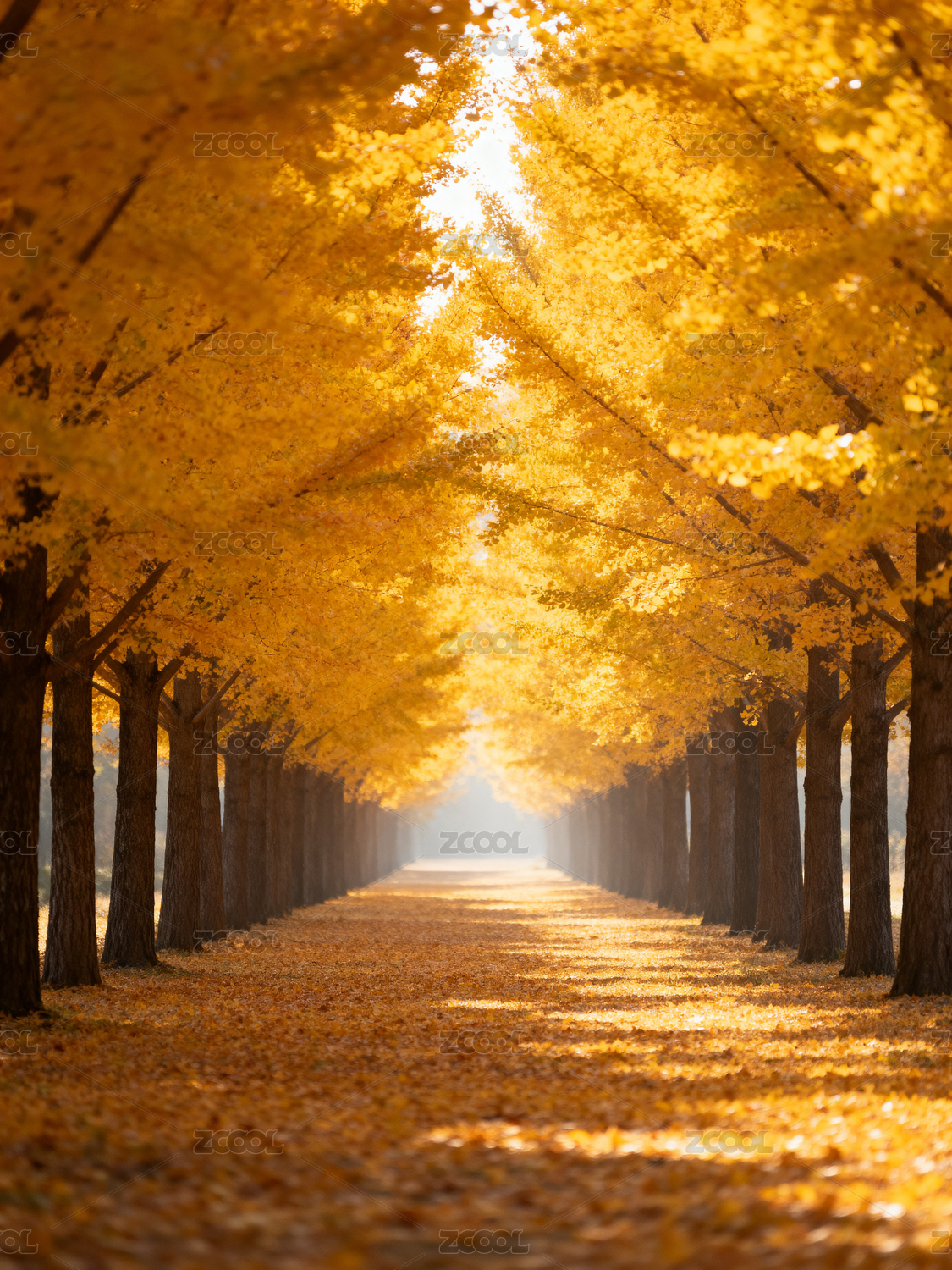 秋天阳光下排列两侧的金黄色的银杏树树林