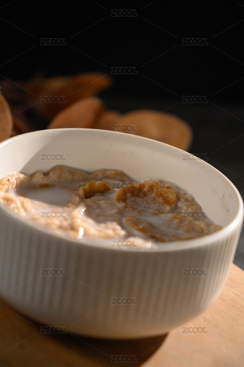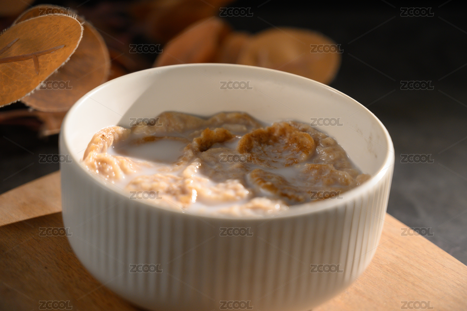 桌面上的碗里美味可口的牛奶荞麦麦片