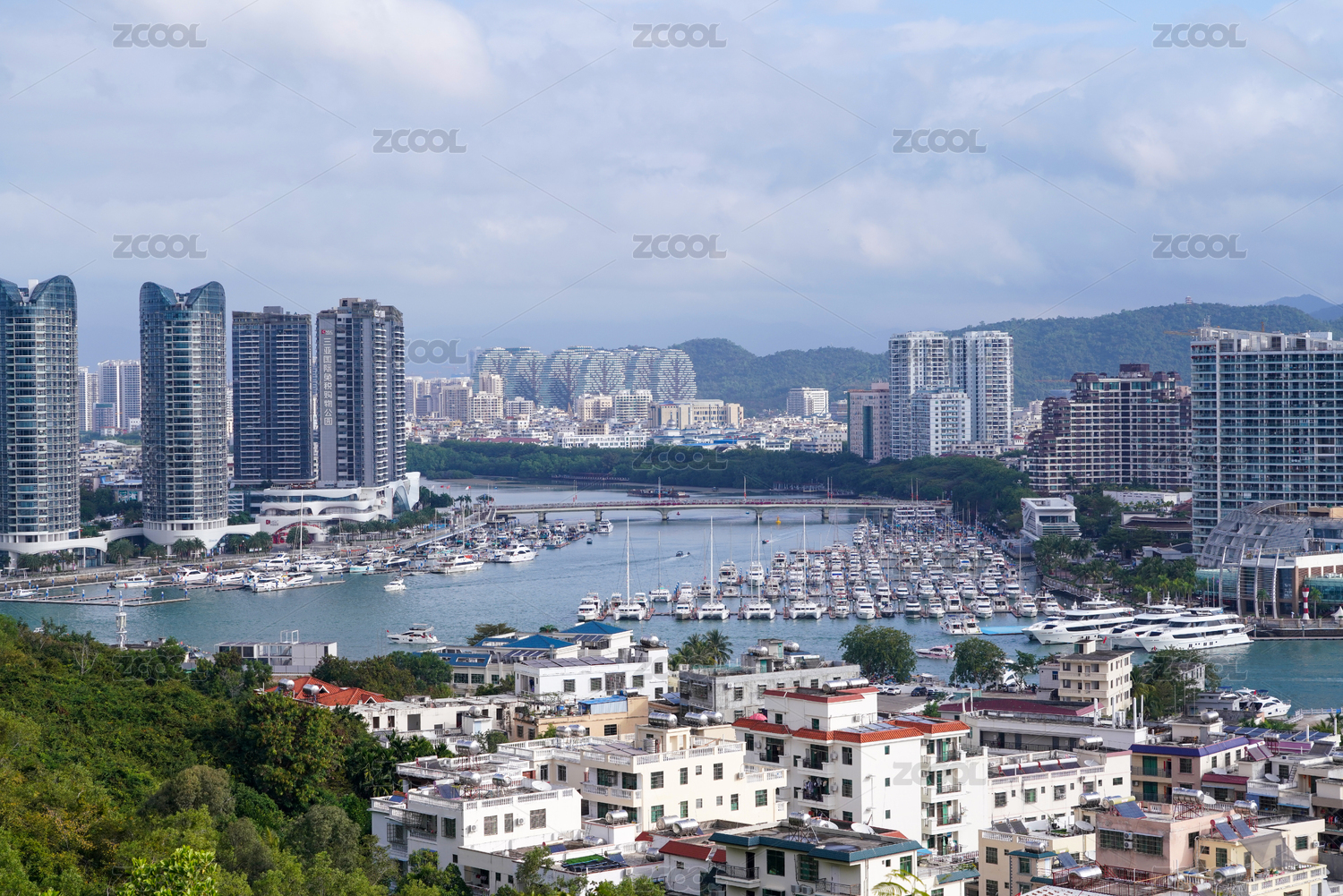 中国三亚游船码头与城市建筑景观