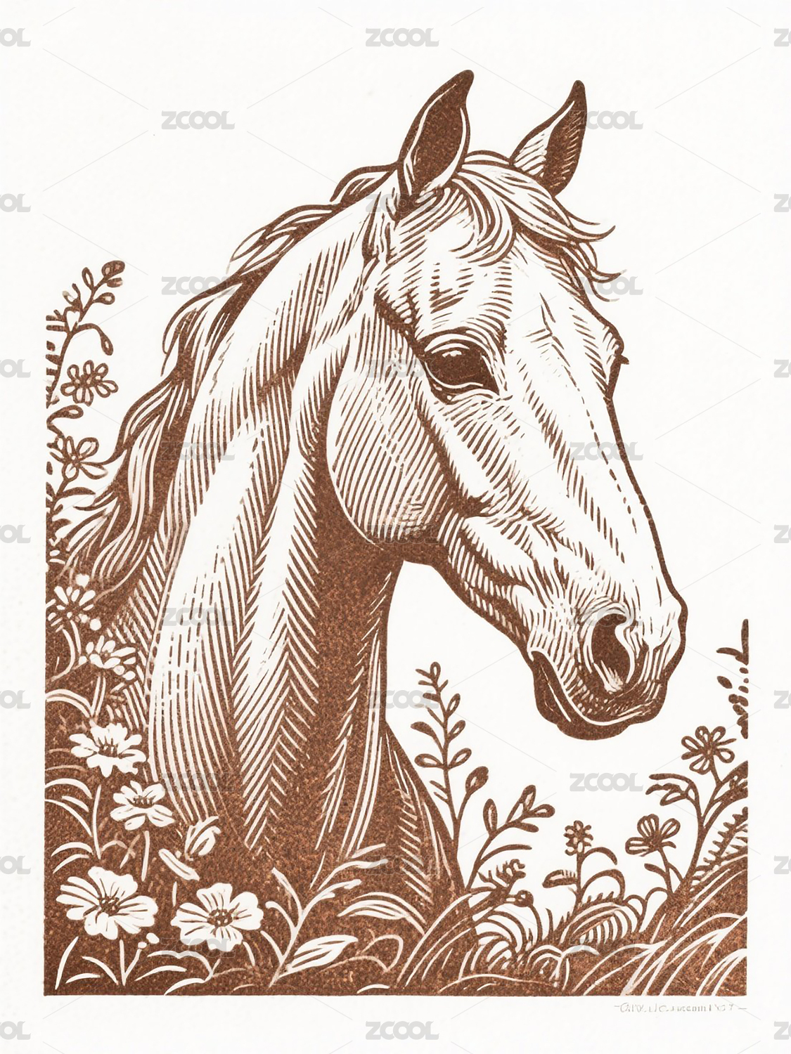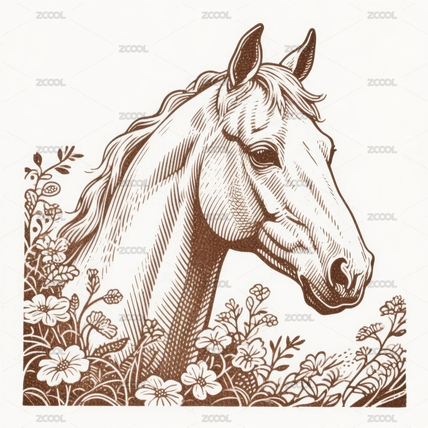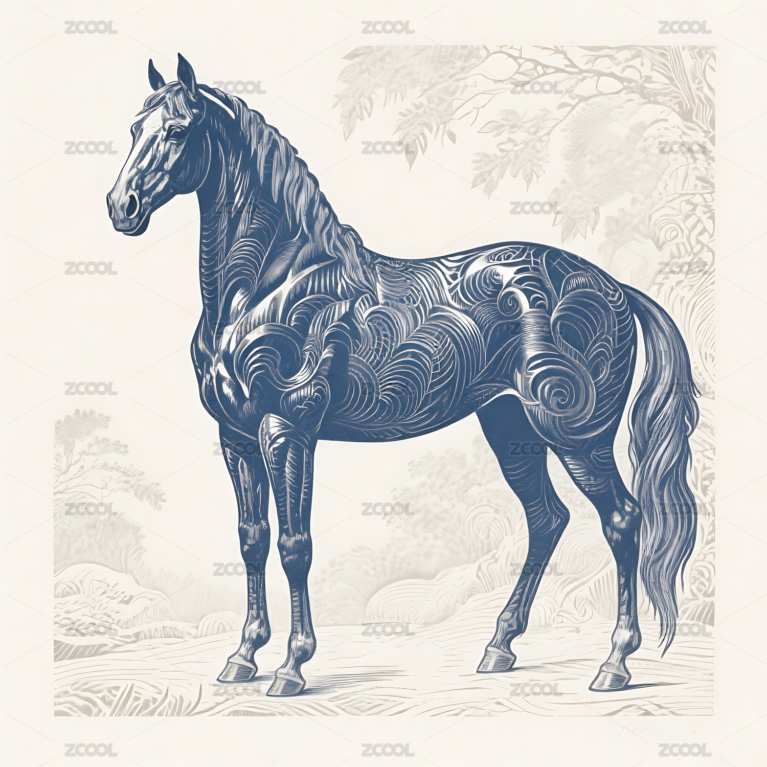 奇幻花卉环绕的蓝绿鬃毛装饰白马插画