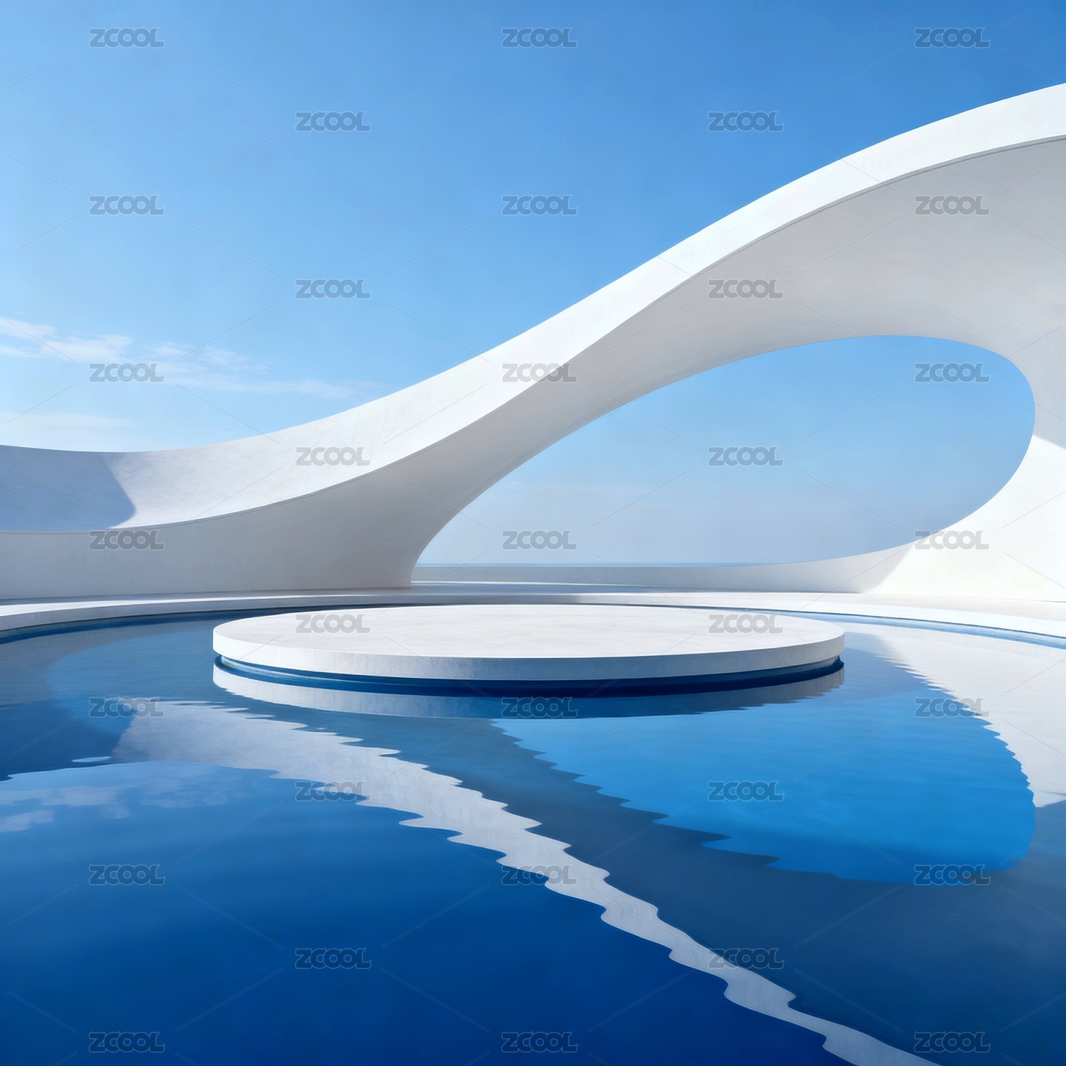 白色曲线建筑与蓝天水面