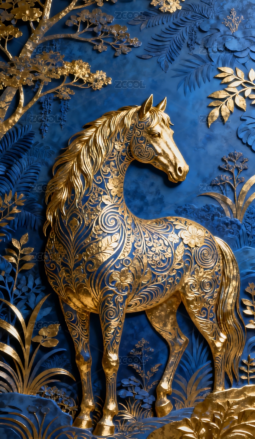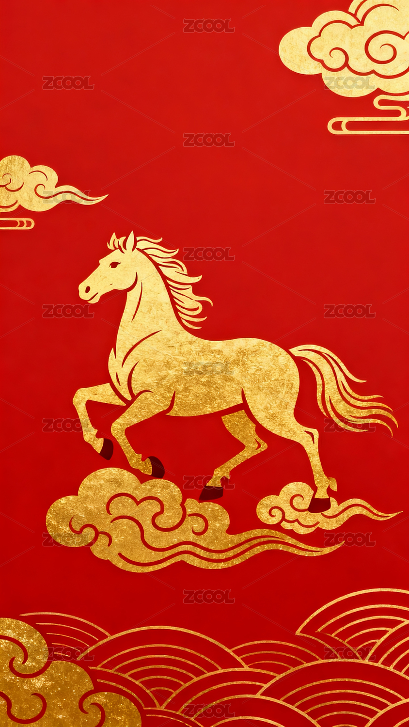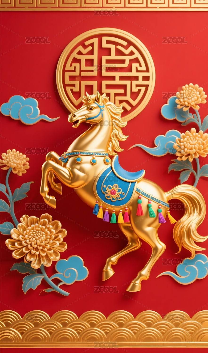 中国传统生肖马敦煌纹样红金配色金线刺绣
