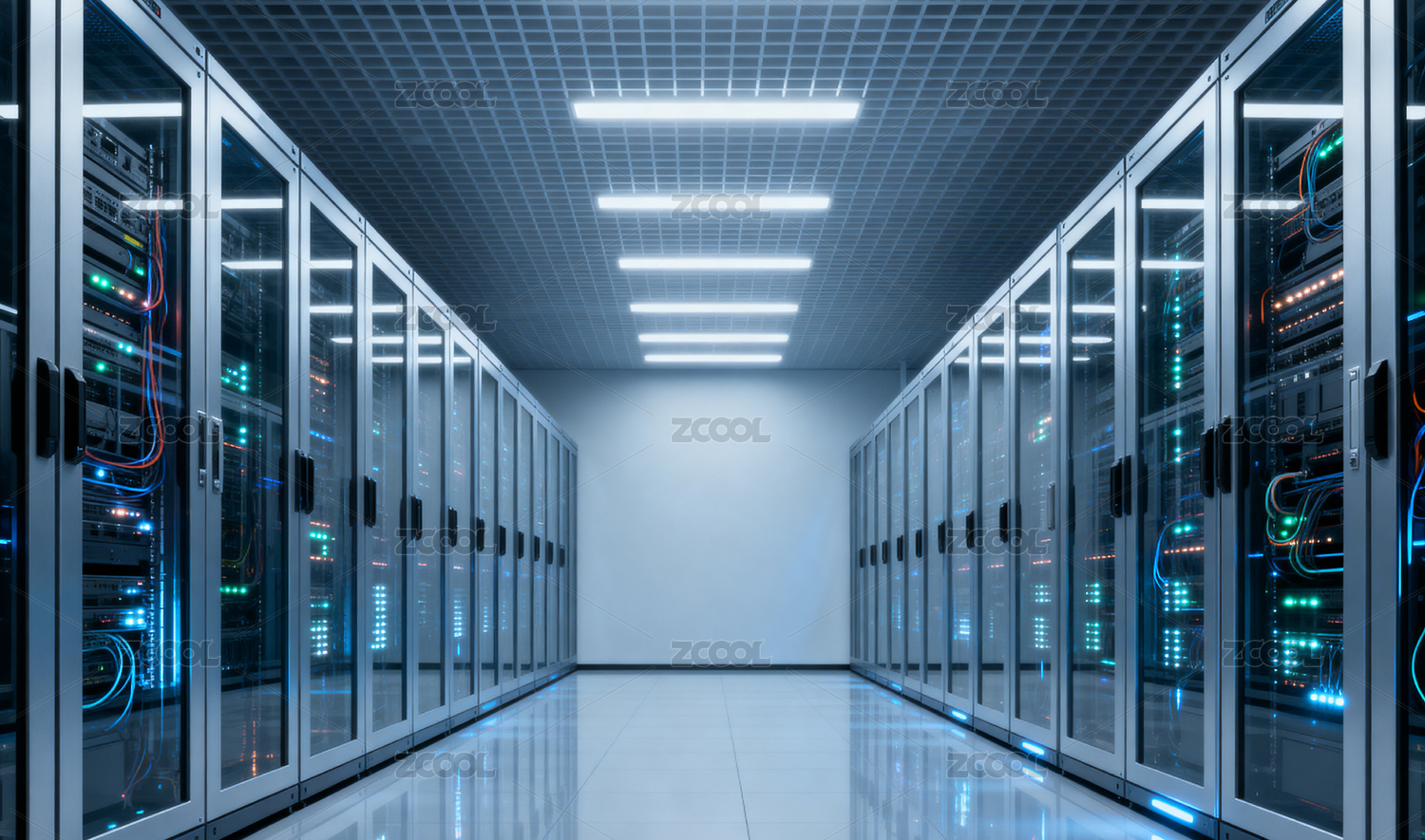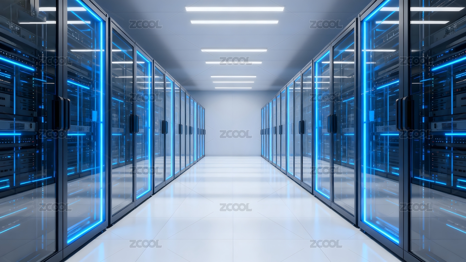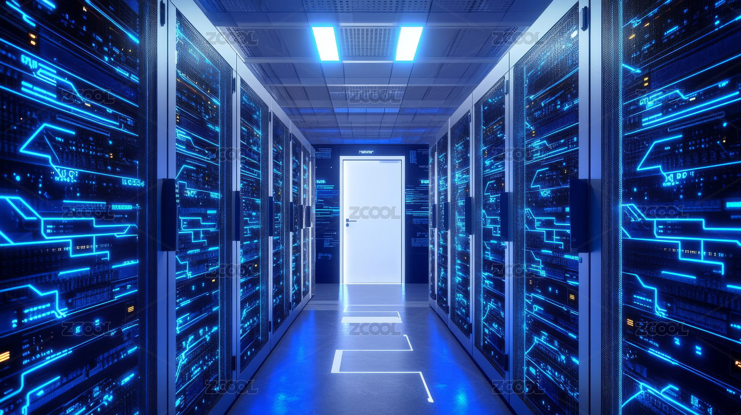 蓝色光效数据中心机房走廊