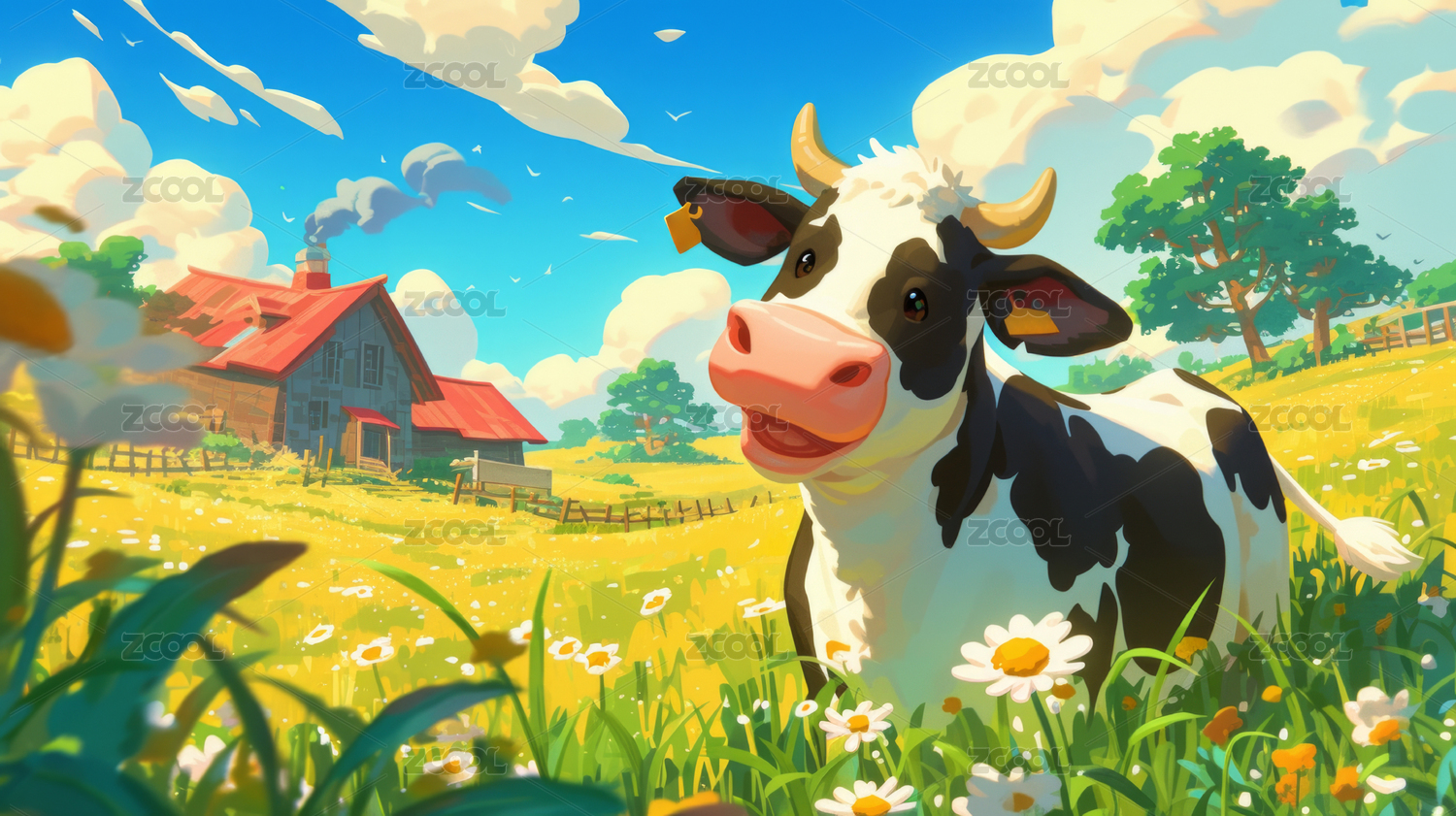 蓝天白云下的奶牛插画