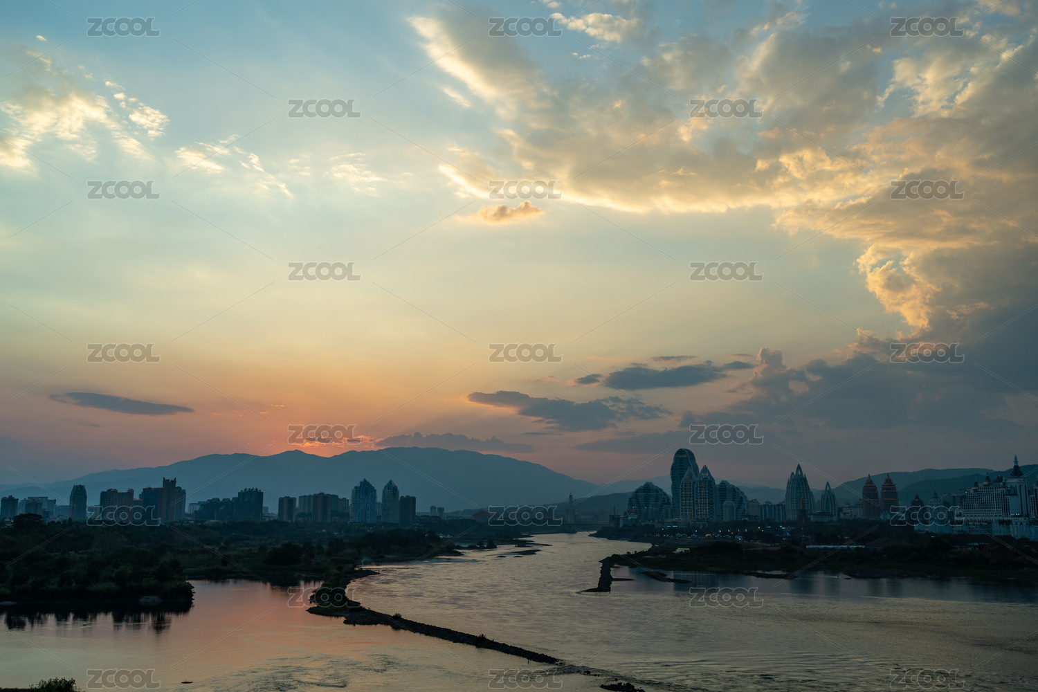 云南省景洪市夜晚澜沧江外滩告庄高楼建筑