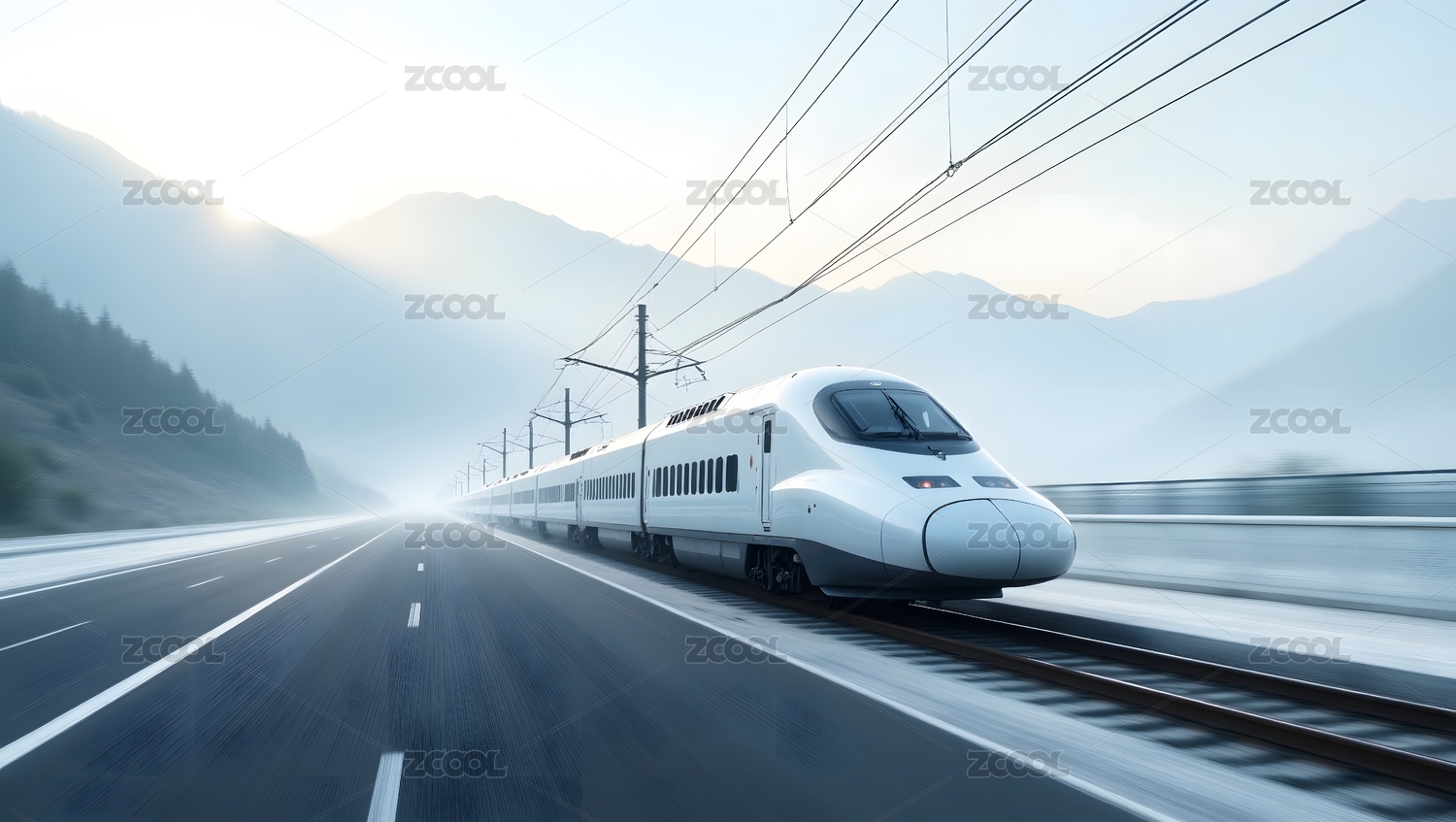 高速列车穿越山峦湖泊