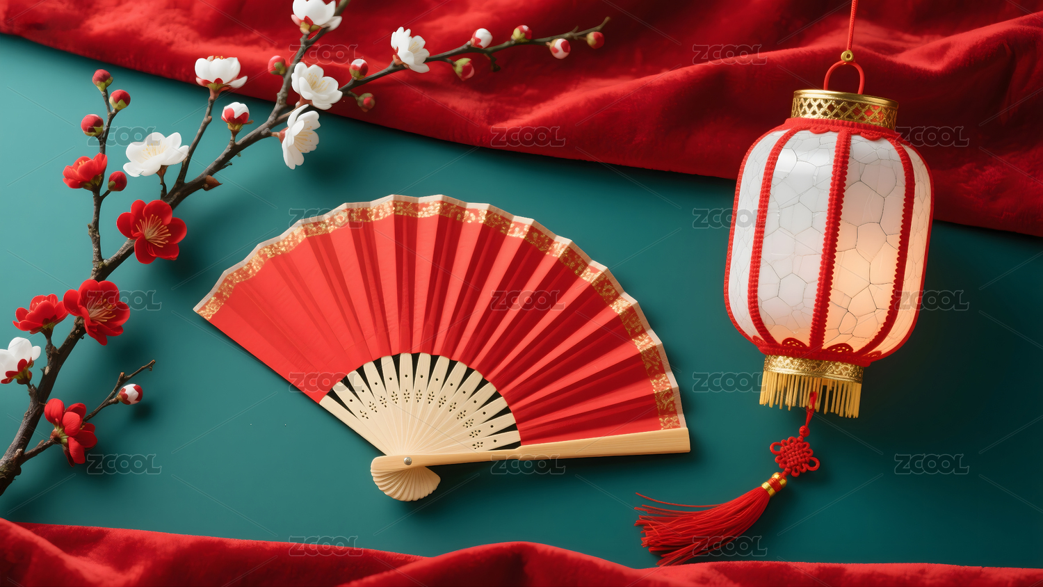 红色扇子配红梅花装饰