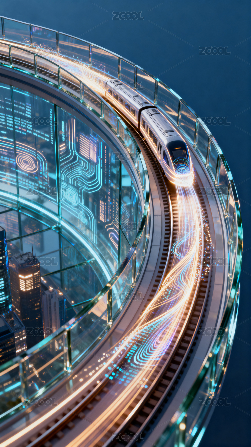 未来感,高铁,蜿蜒,轨道,夜晚,城市,天际线,发光,轨迹,科技