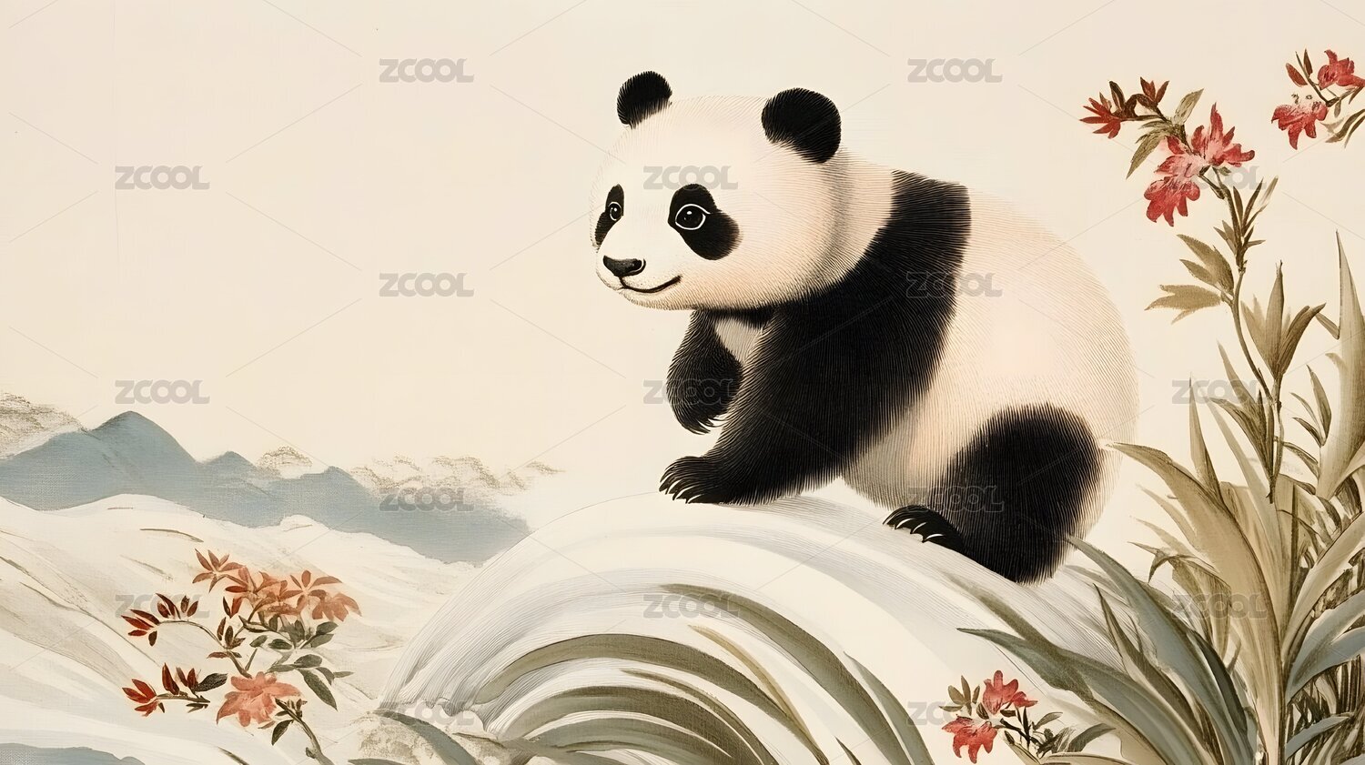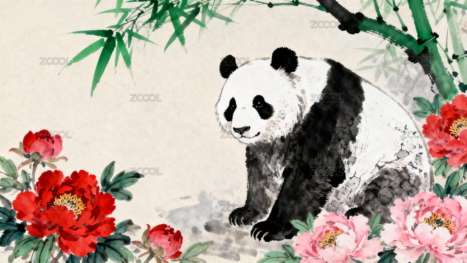 熊猫,国画,水墨画,牡丹,翠竹,竹子,中国风,传统,绘画,工笔画