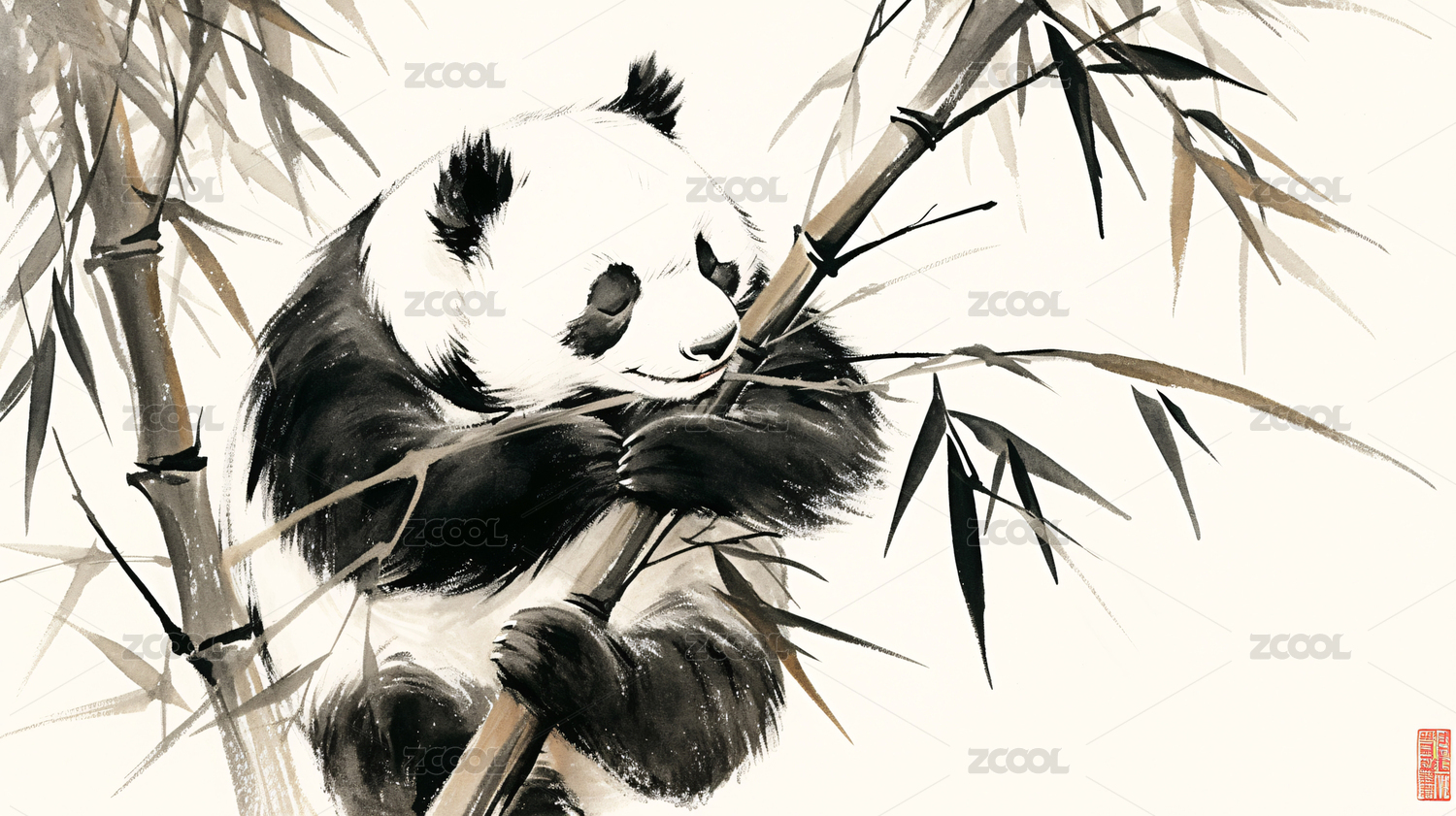 一只抱着竹子躺地上睡觉的可爱熊猫水墨插画