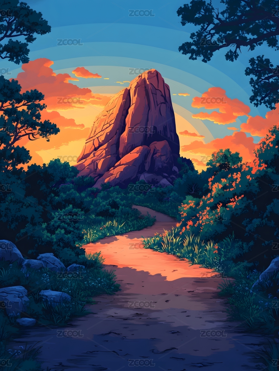 卡通山水风景小径画