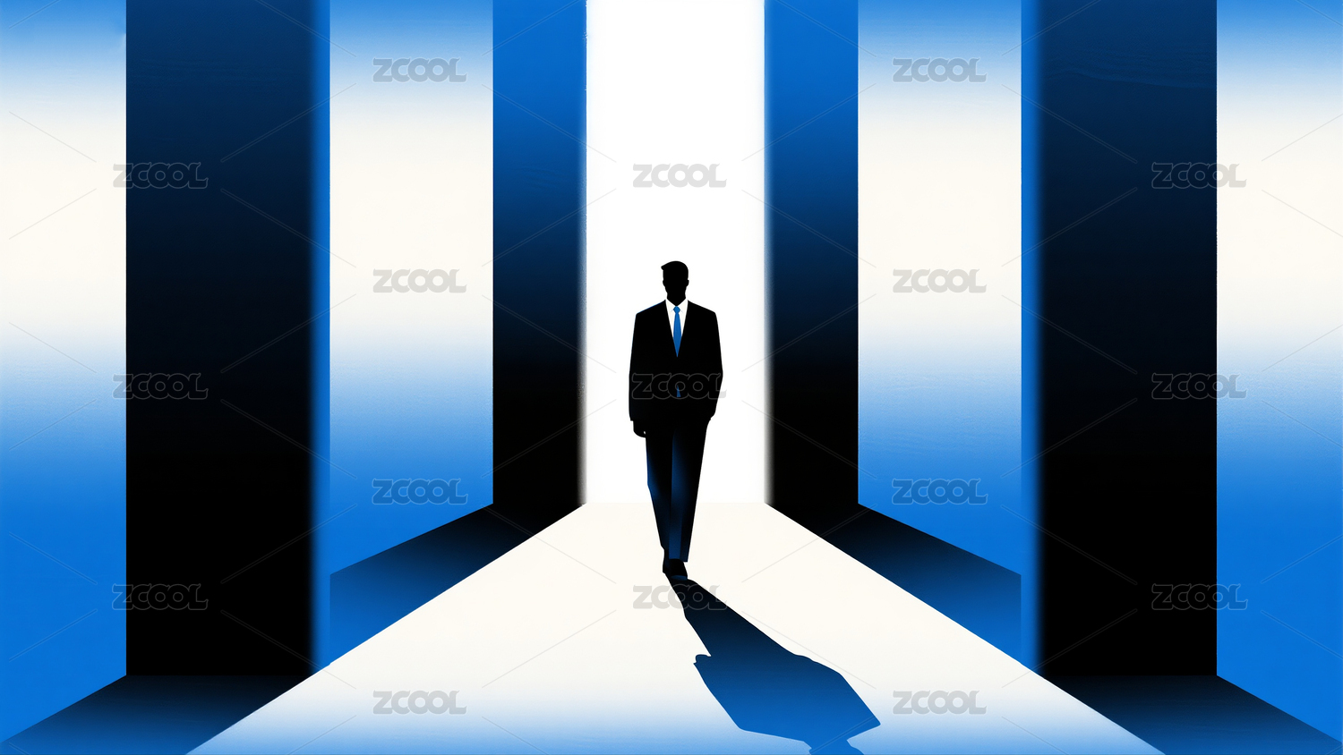 穿西装的剪影人物在蓝白渐变的发光通道行走
