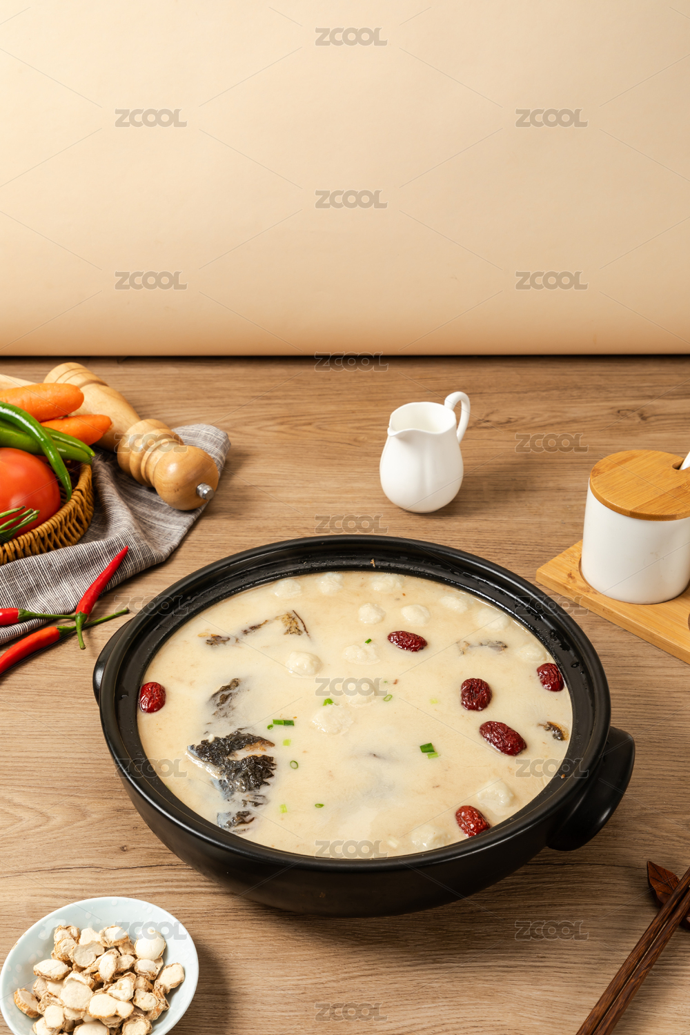 俯拍复古场景中装在白色炖锅中的椰子鸡