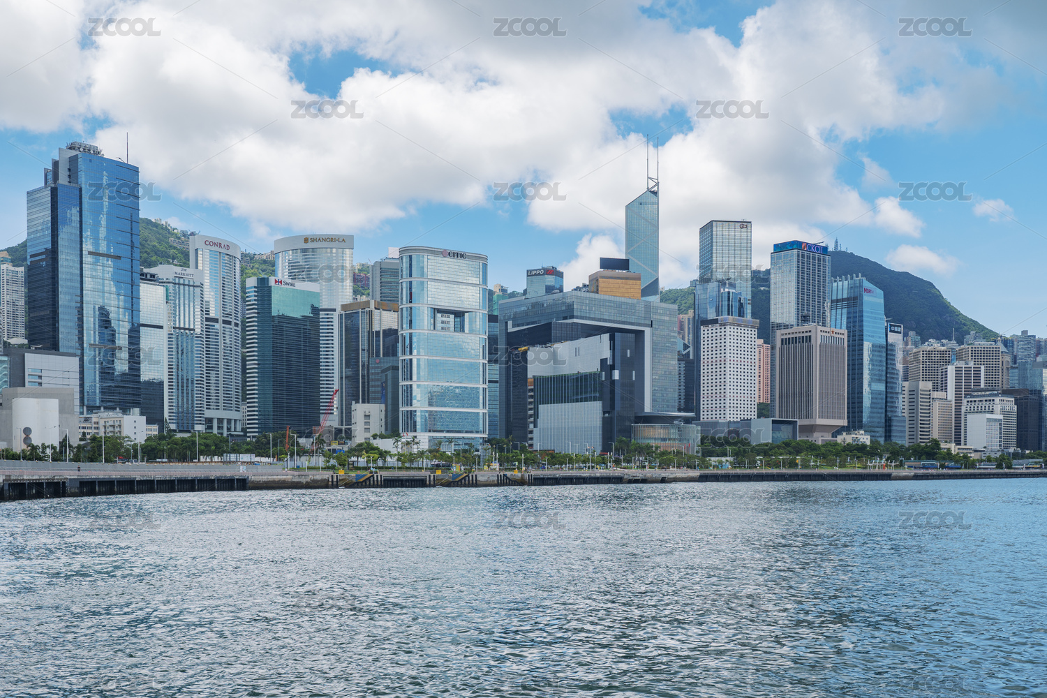 中国香港城市天际线 晴朗天气 国际金融中心 中环码头
