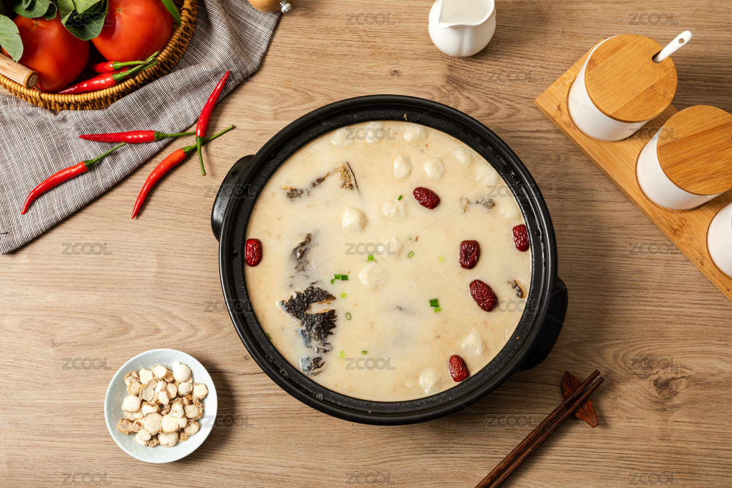 中式复古场景中装在白色炖锅中的椰子炖鸡