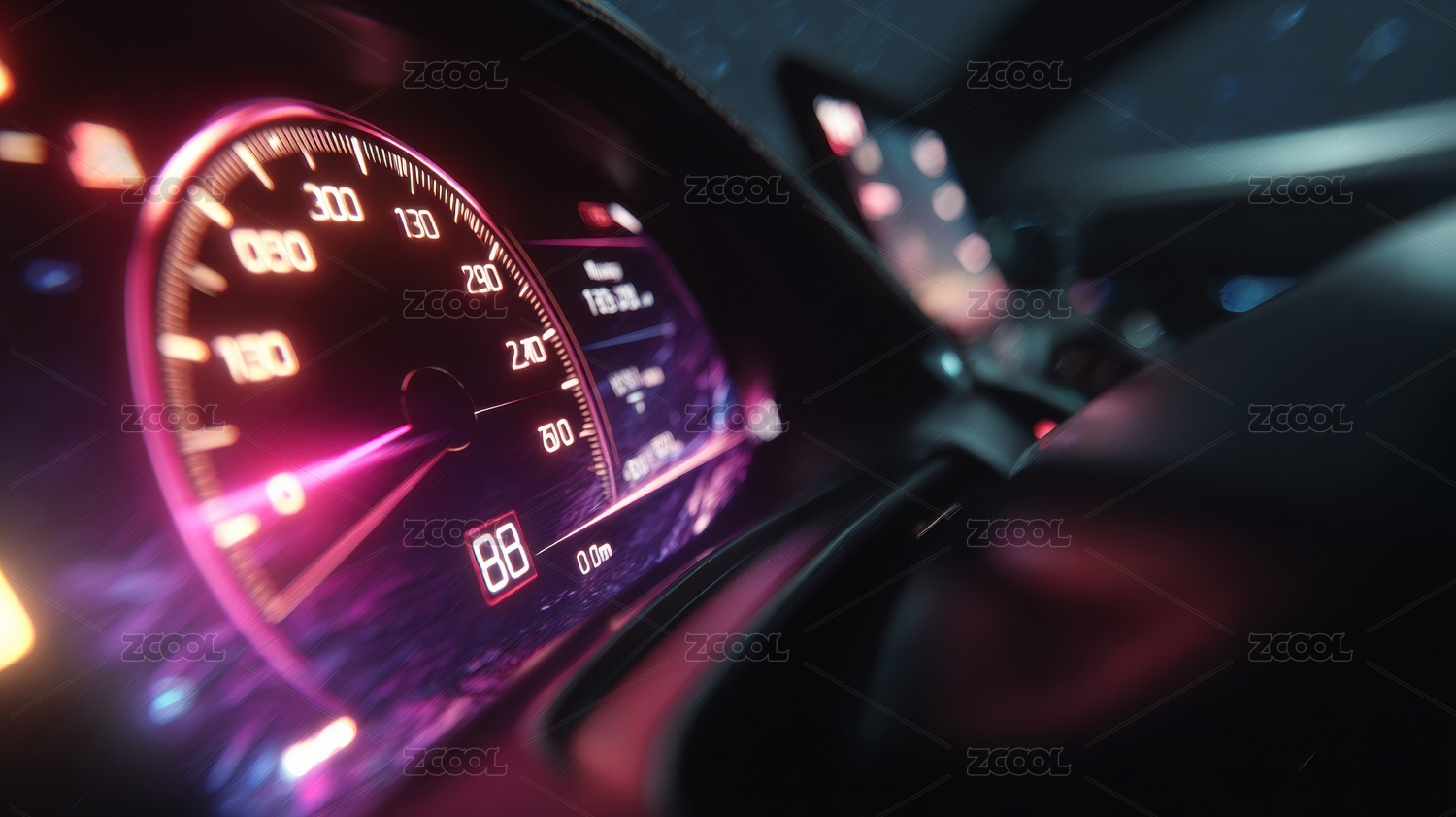 车内仪表盘显示速度与夜景