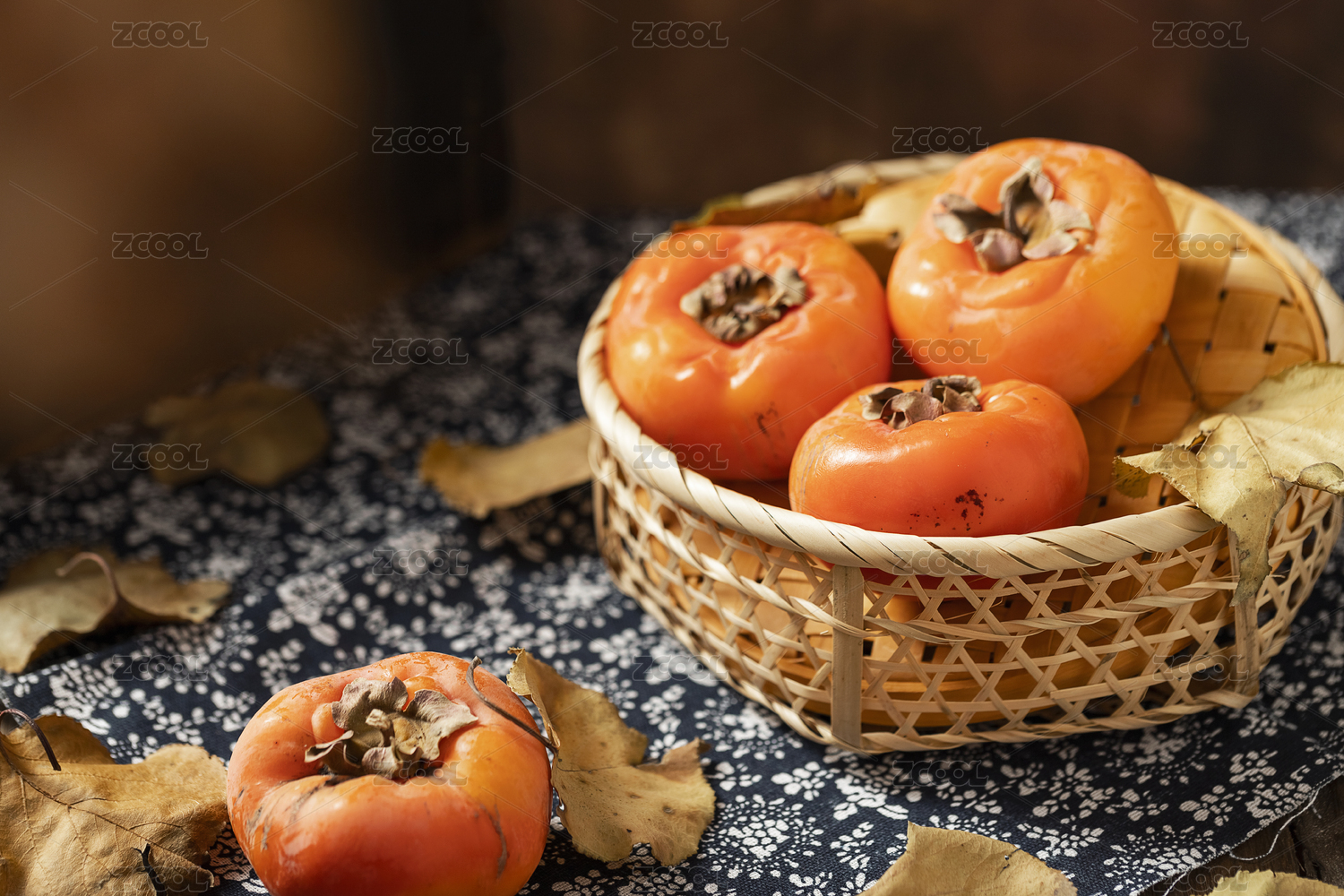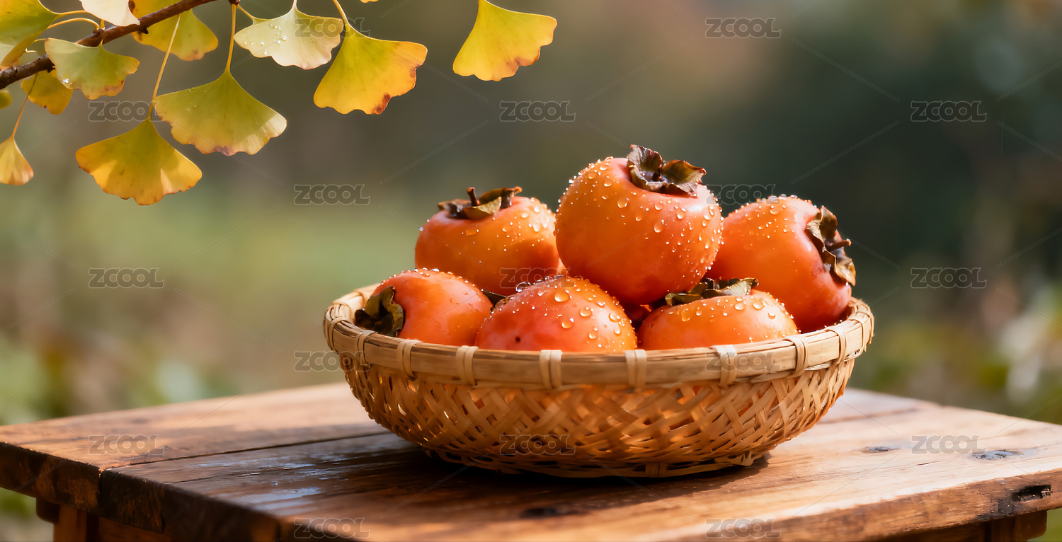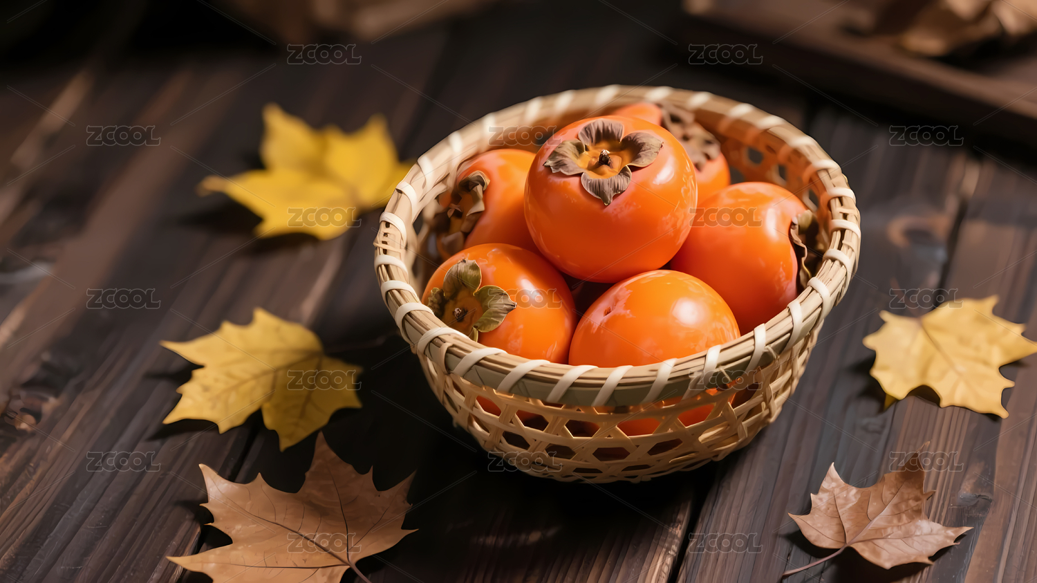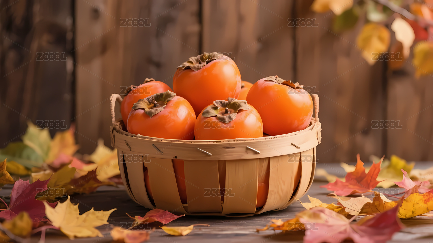 柿子,竹筐,背景,壁纸,秋天,24节气,丰收,果实,金色,树叶