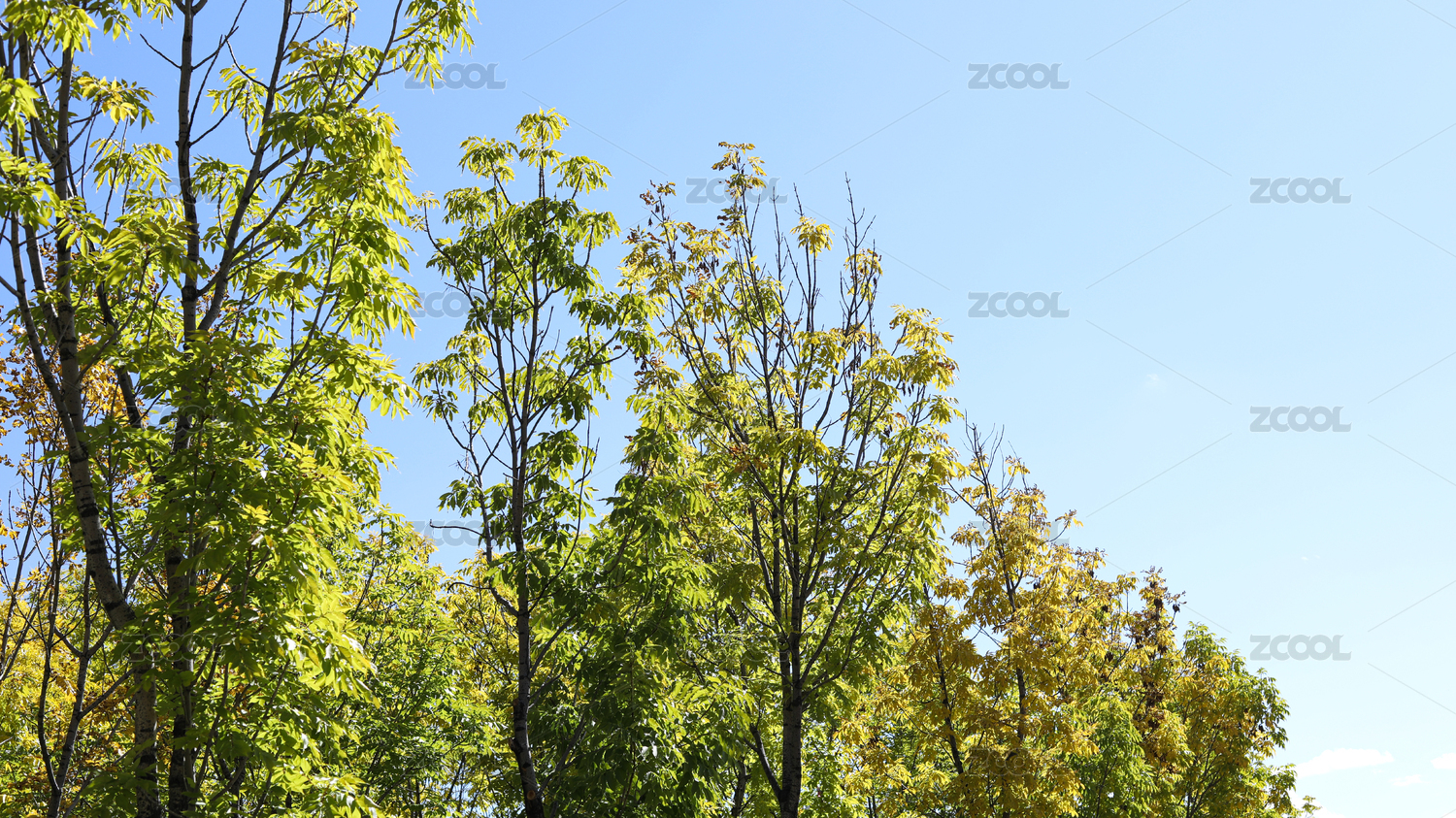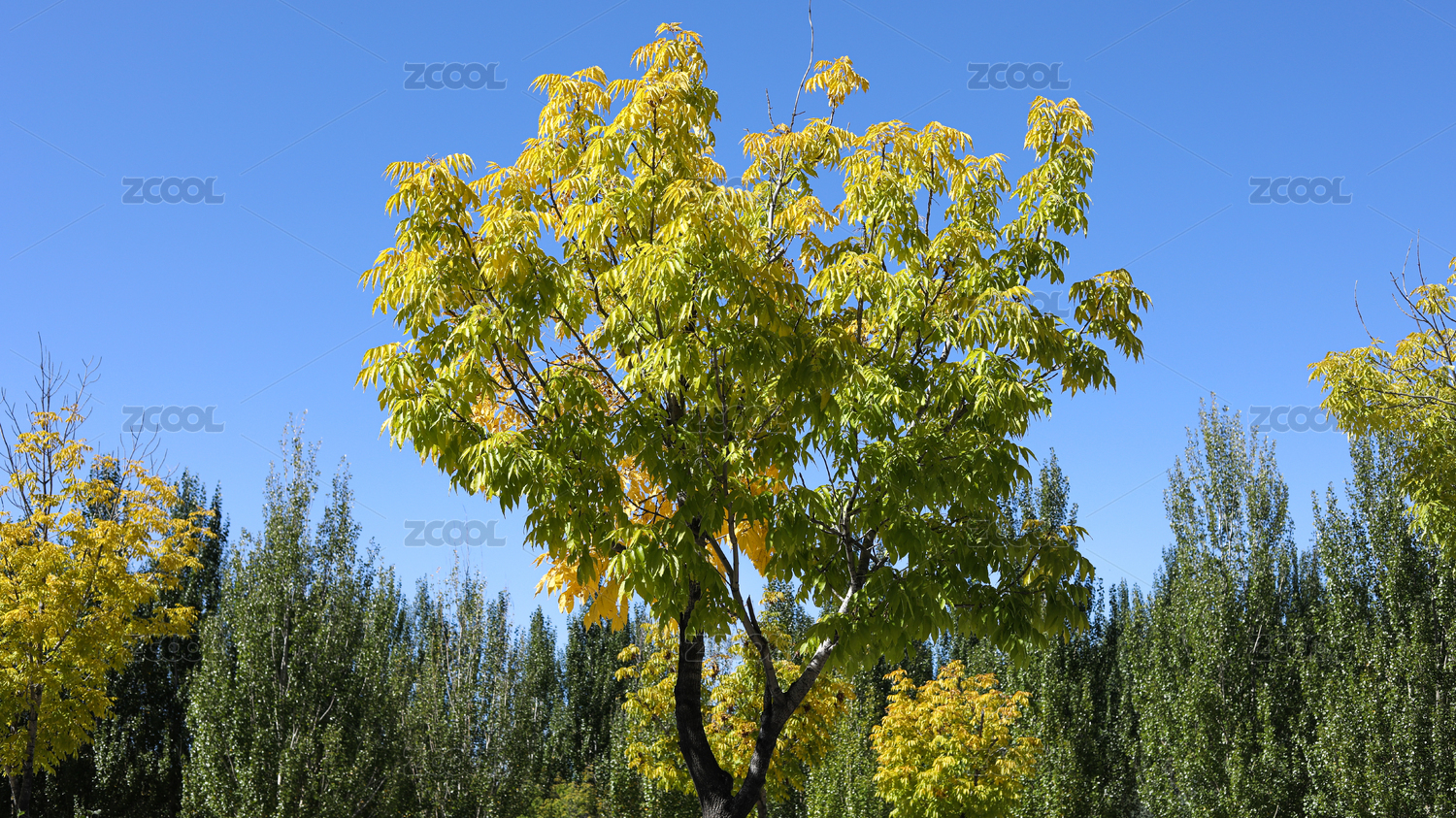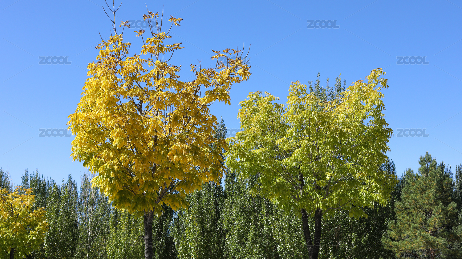 吉林省长春市净月潭秋日晴空下的金黄色大树
