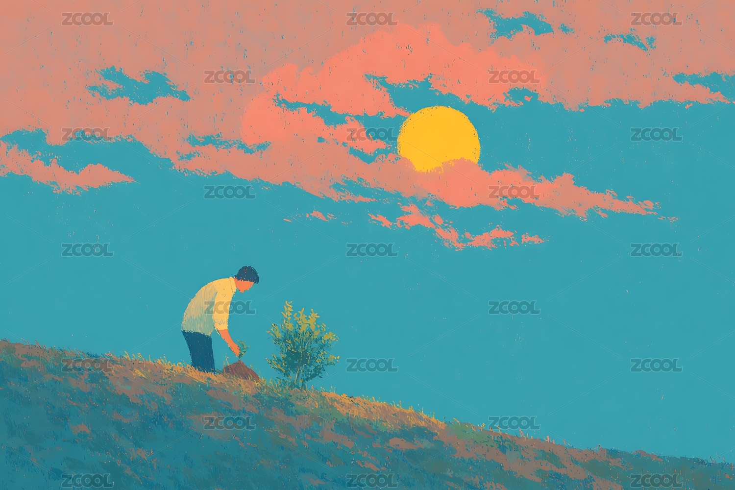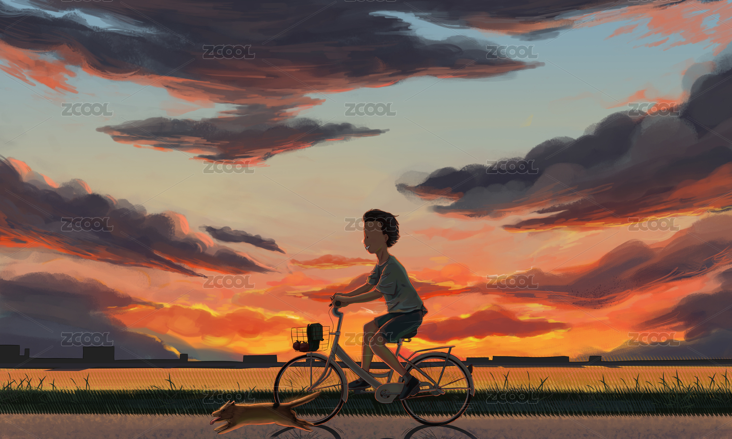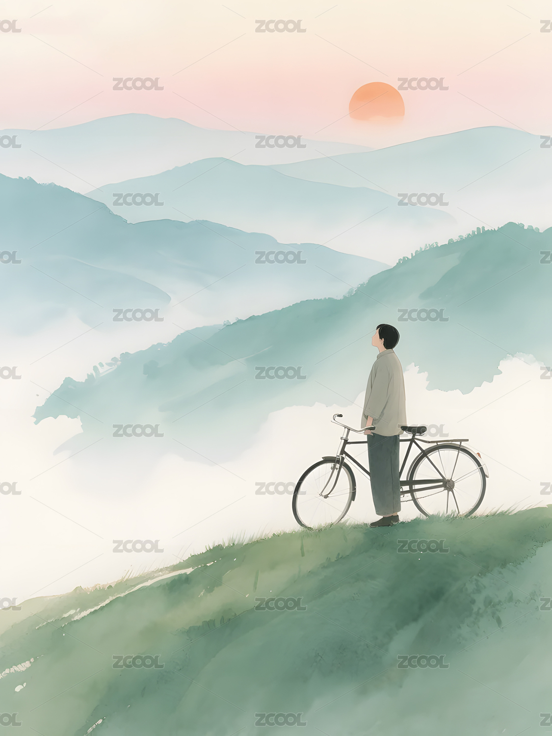 水彩,坡顶,青山,落日,自行车,停靠,人物,脚步,远方,山峦