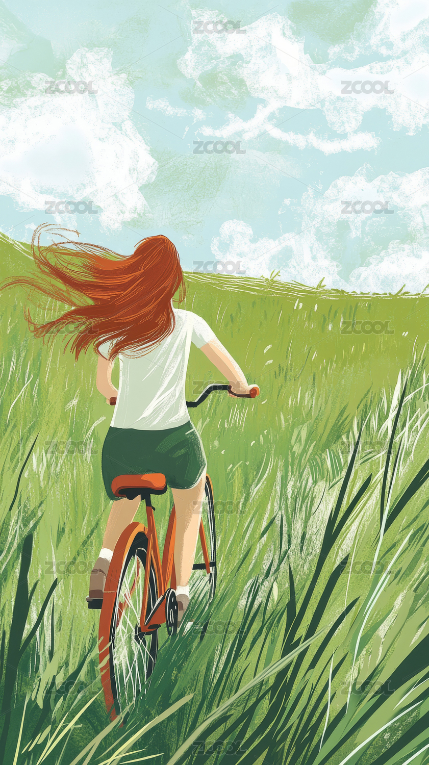 夏天草地女孩小狗白云快乐奔跑治愈插画