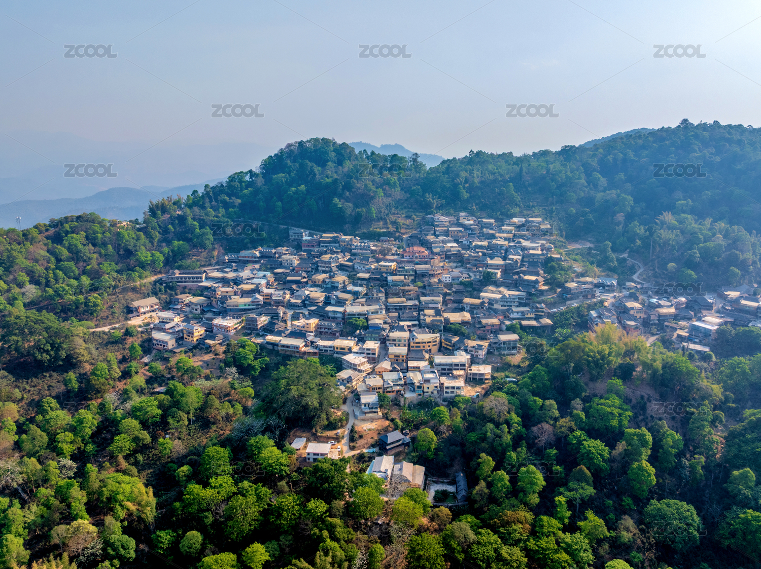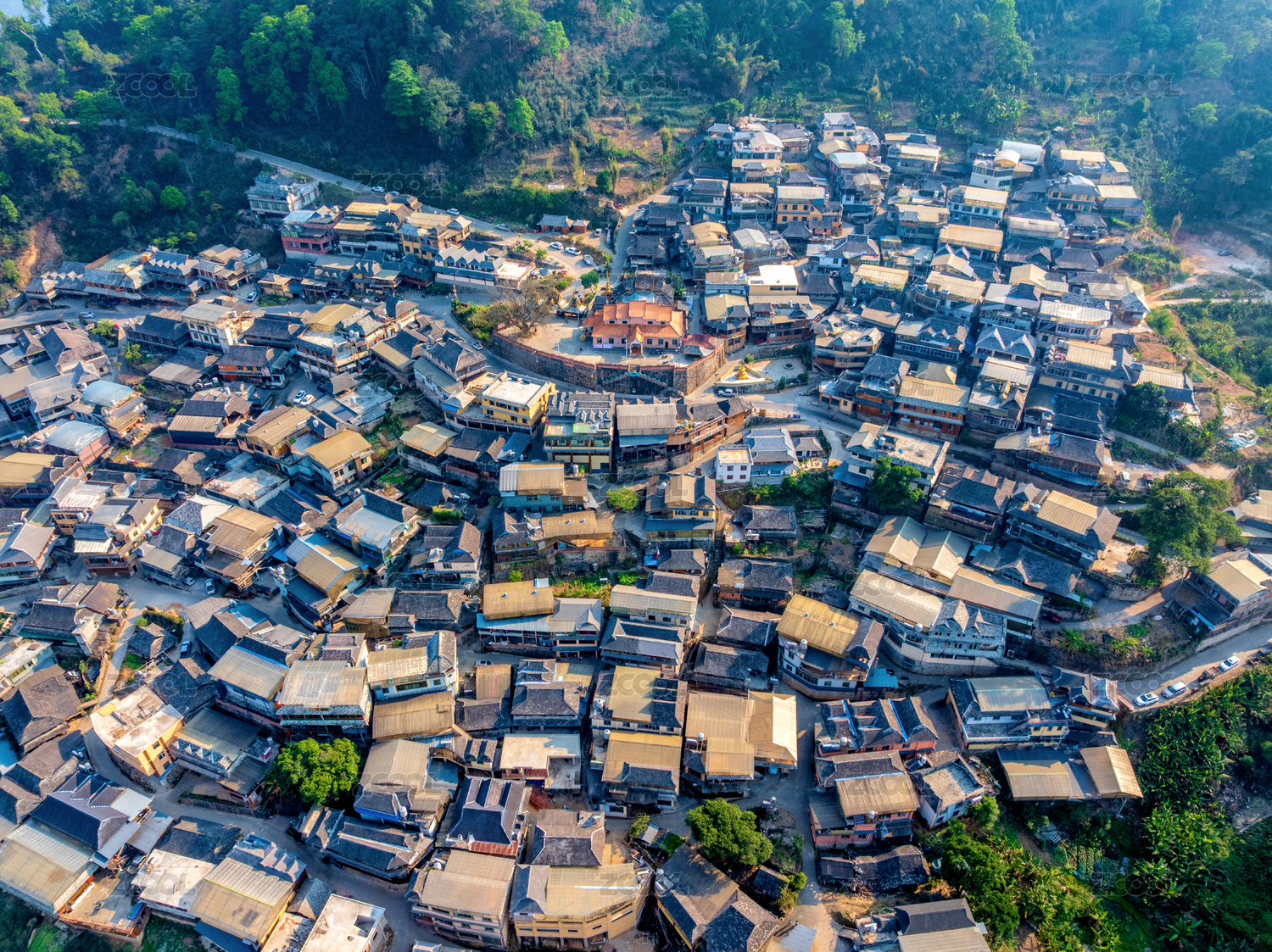 航拍被森林环绕的景迈山村庄全景