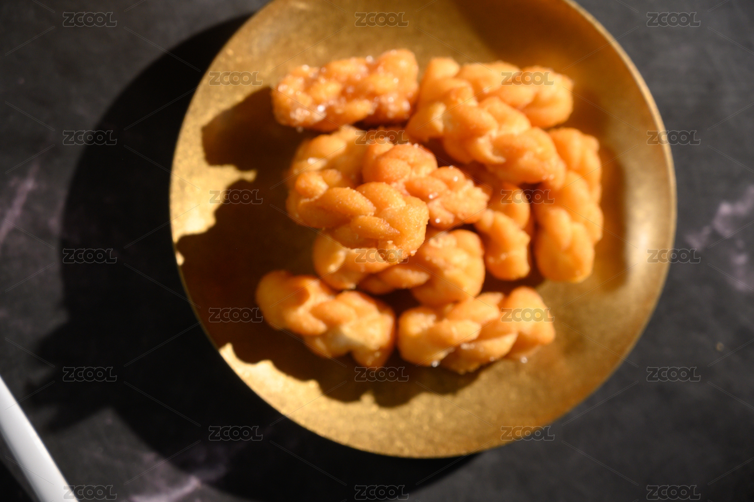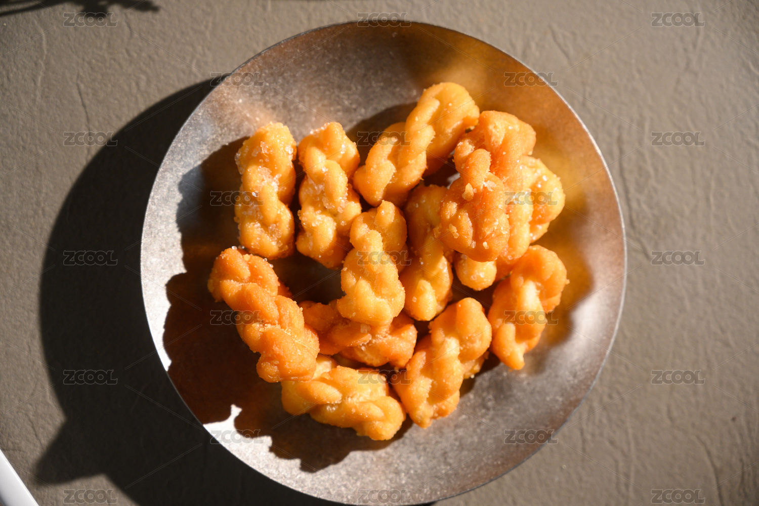 桌面上的盘子里的美味可口的糖麻花