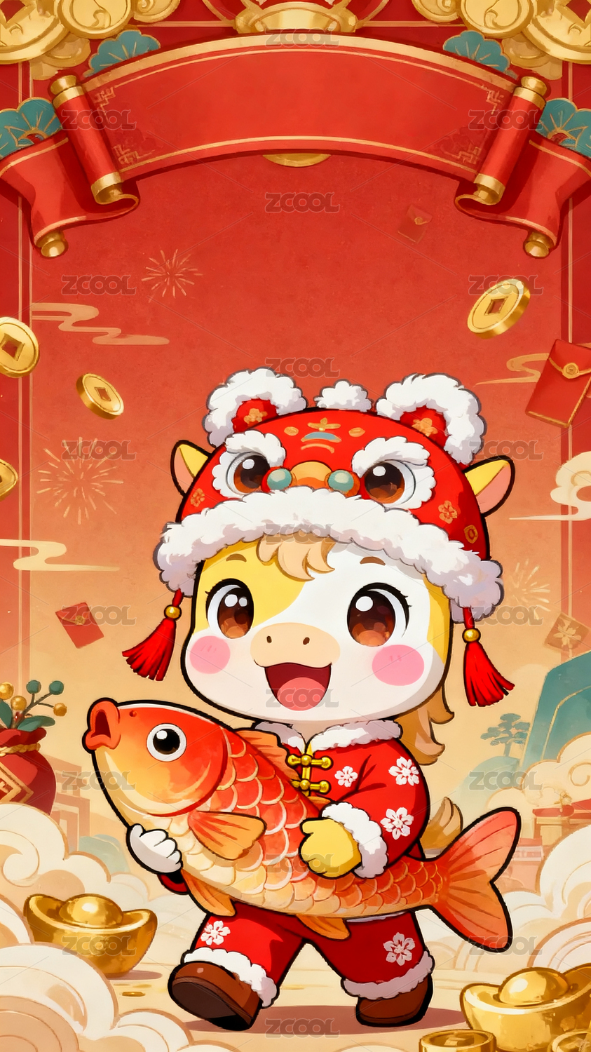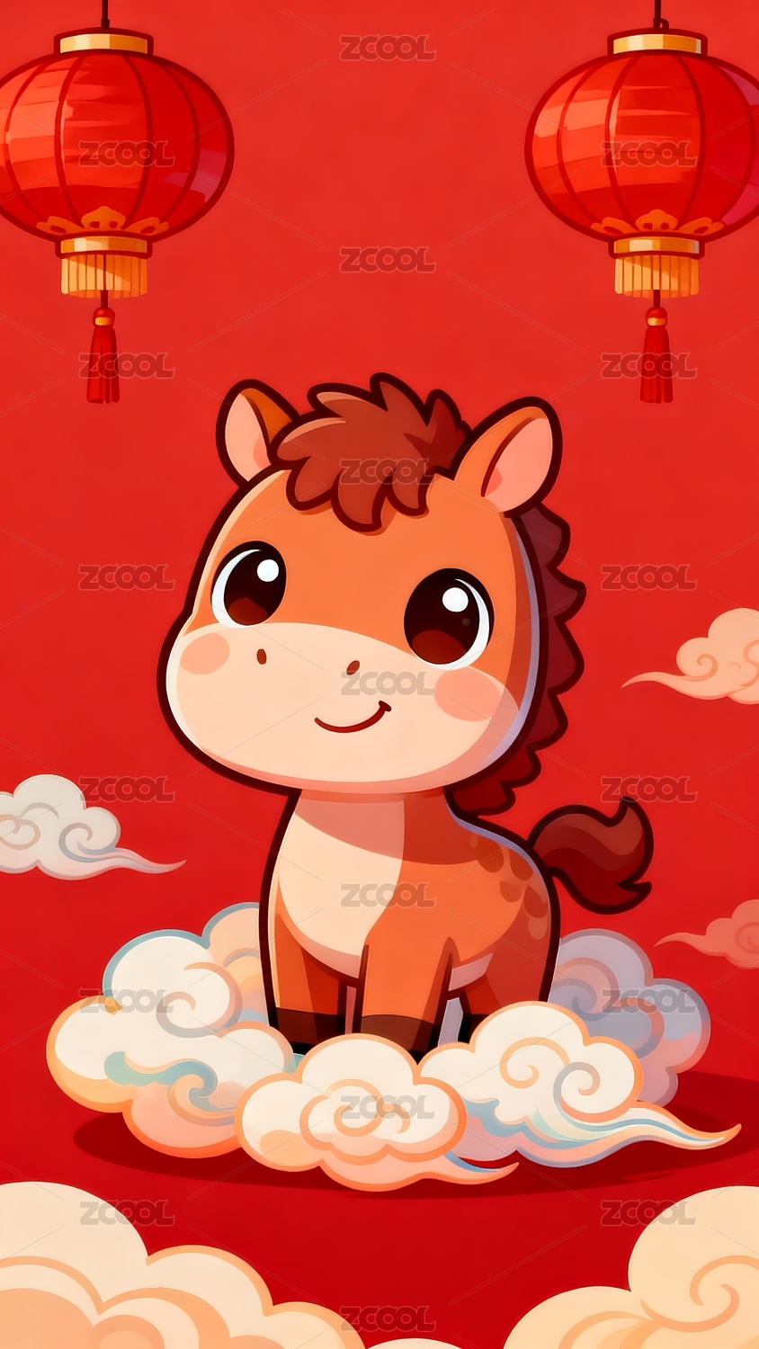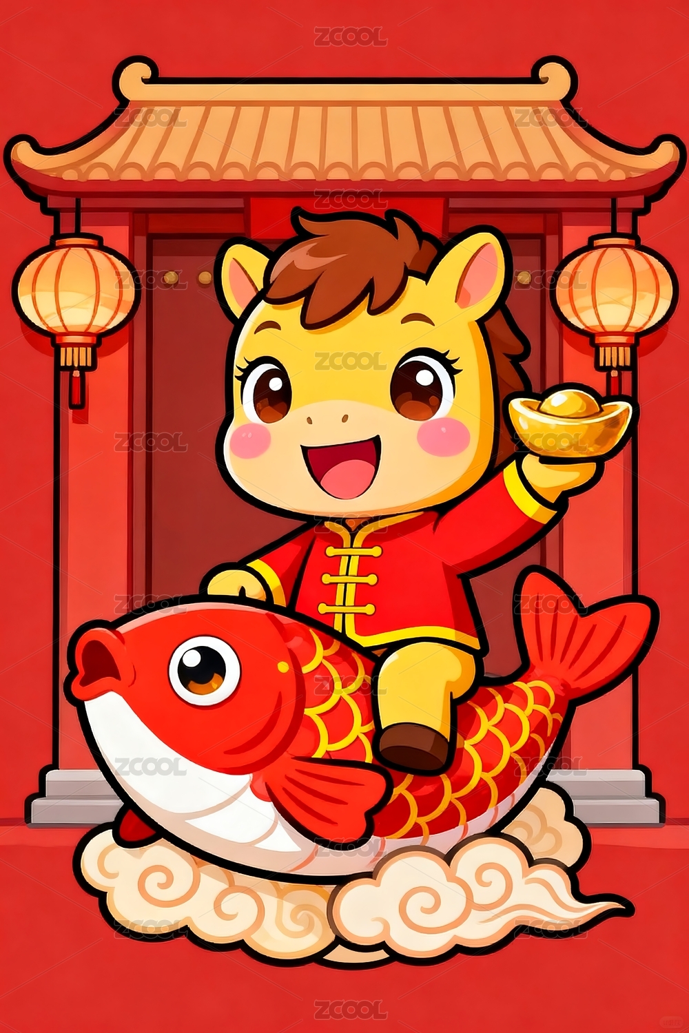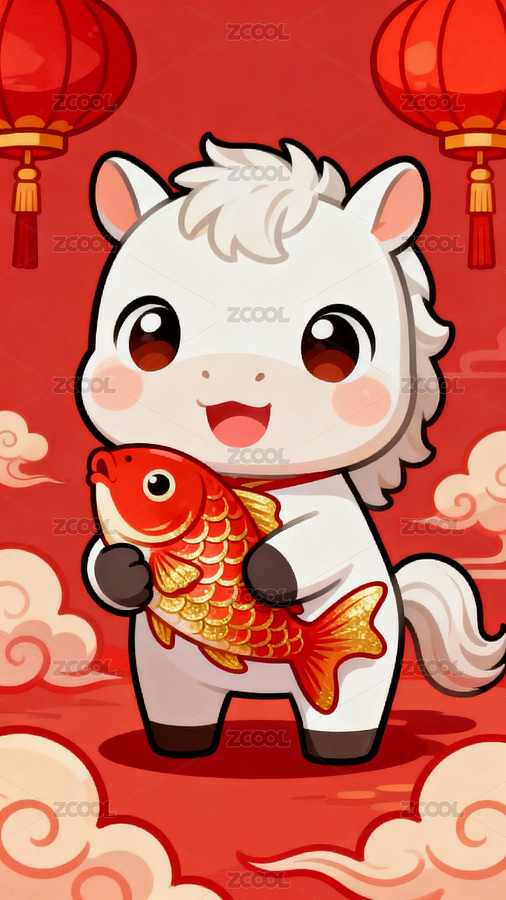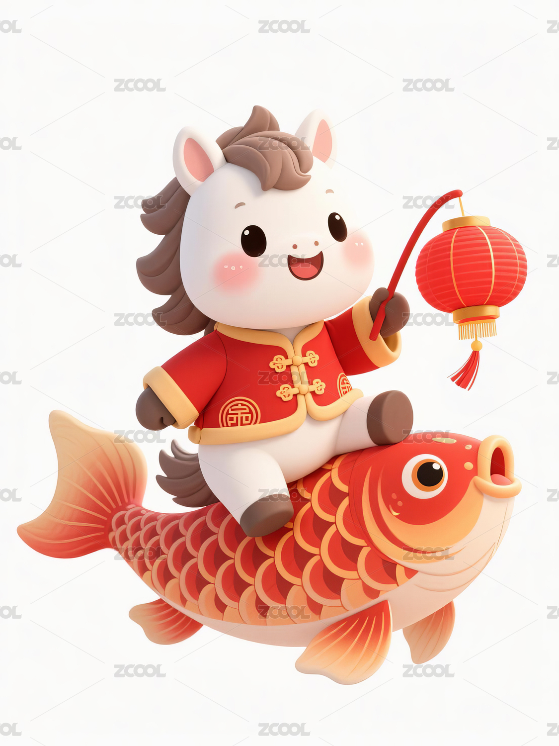 小马,金鱼,云纹,中国风,灯笼,生肖,动物,可爱,插画,锦鲤