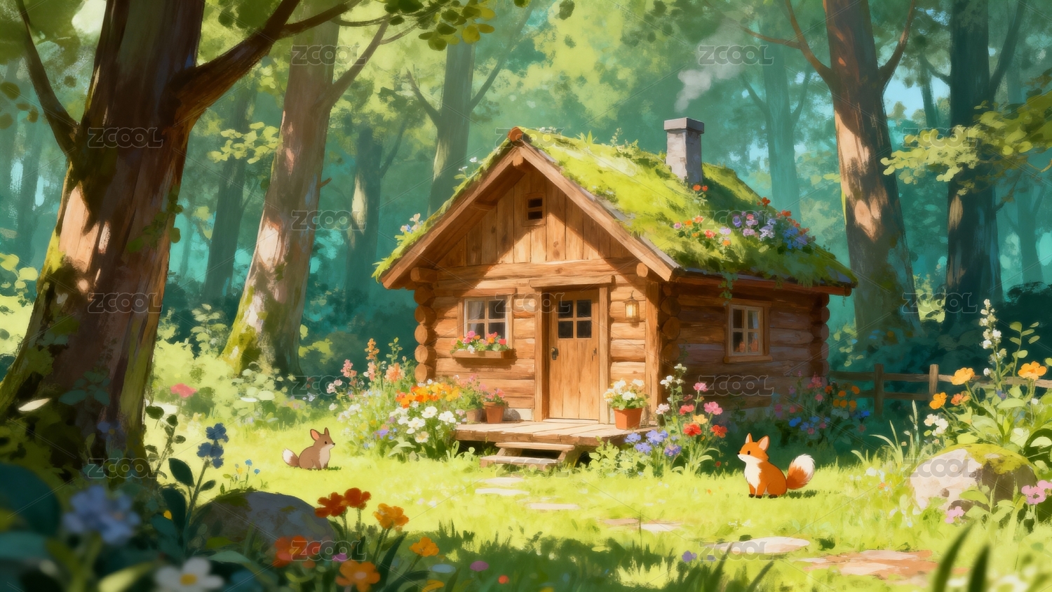 唯美,风景,插画,屋,树,樱花树,花草,蝴蝶,小屋