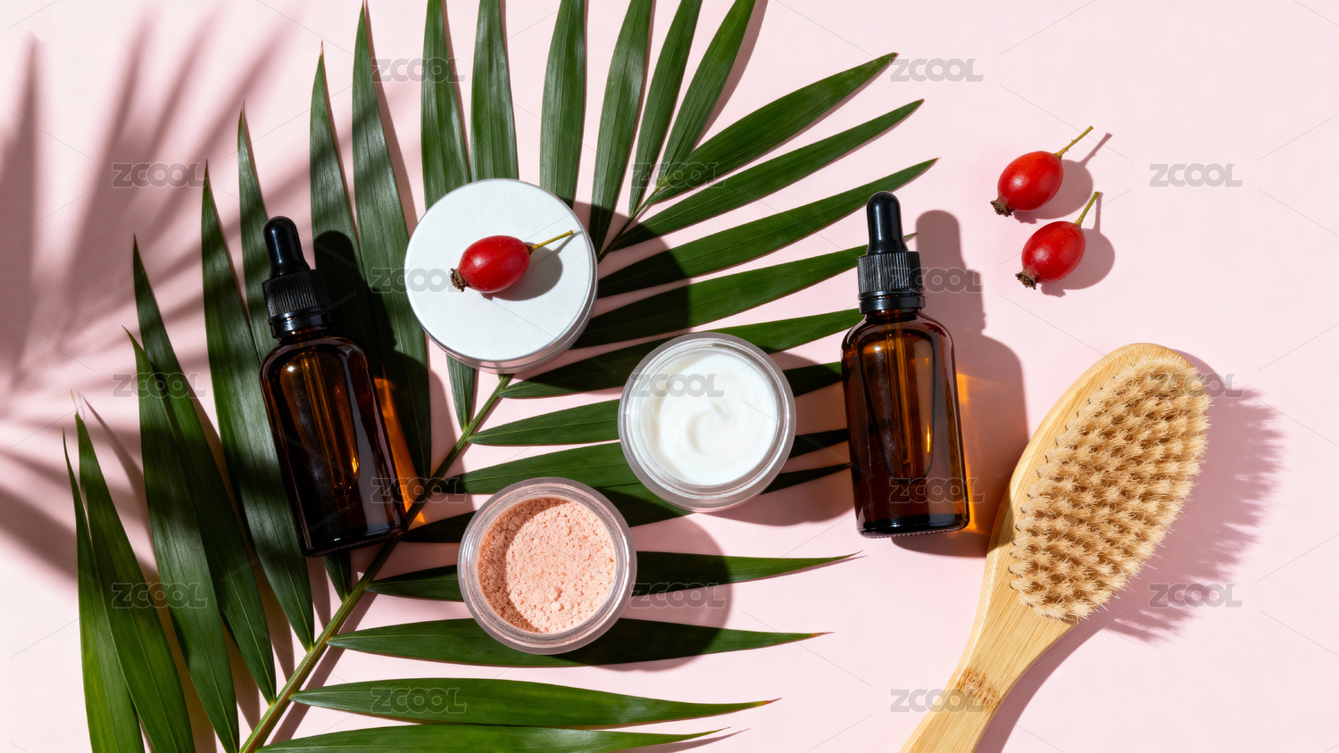 粉色背景上的护肤产品与棕榈叶影