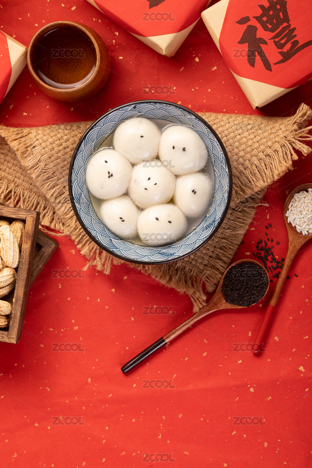 俯拍红色背景上装在碗里的黑芝麻汤圆