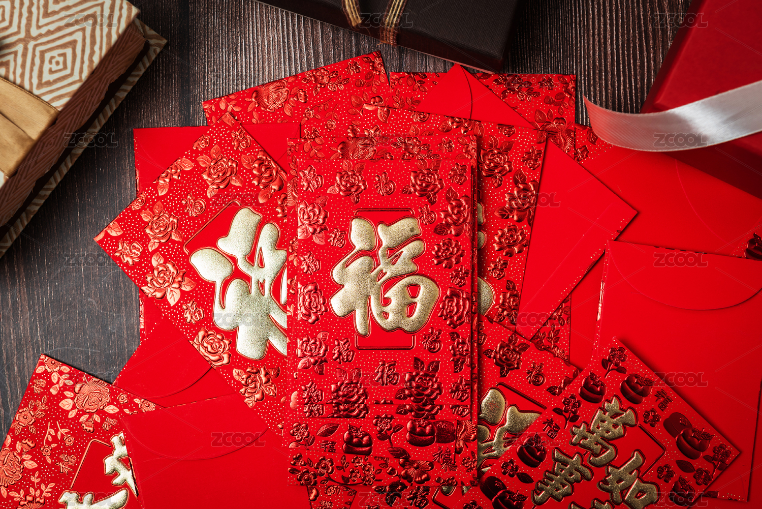 放在桌面上的一叠新春佳节祝福红包和礼物盒