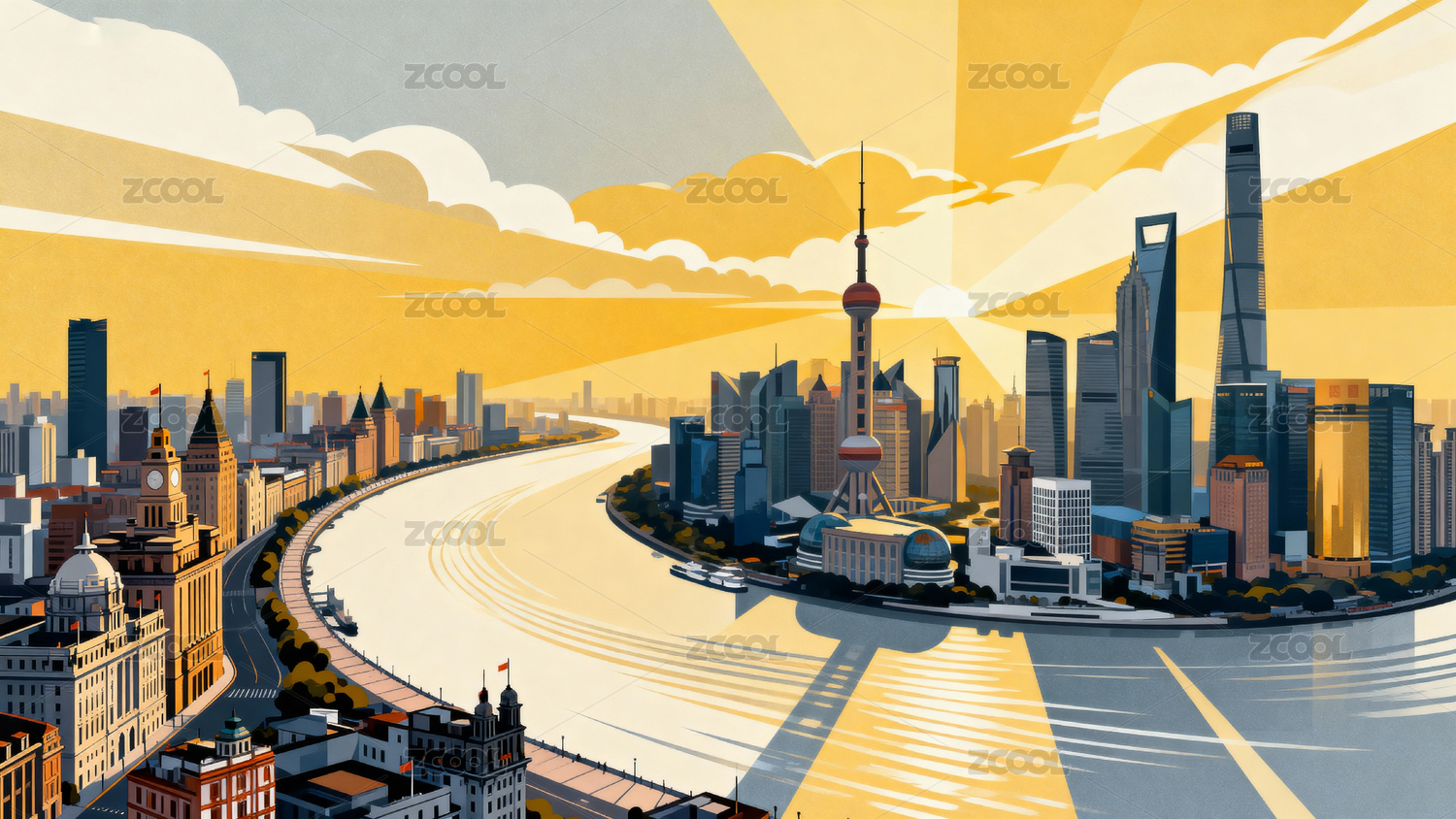 插画风格,上海陆家嘴城市风光