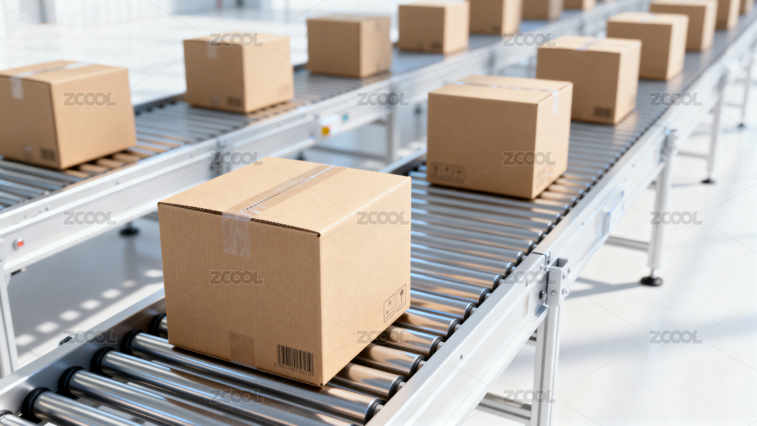 快递包裹在传输带上运输,网上购物,物流自动化管理理念。