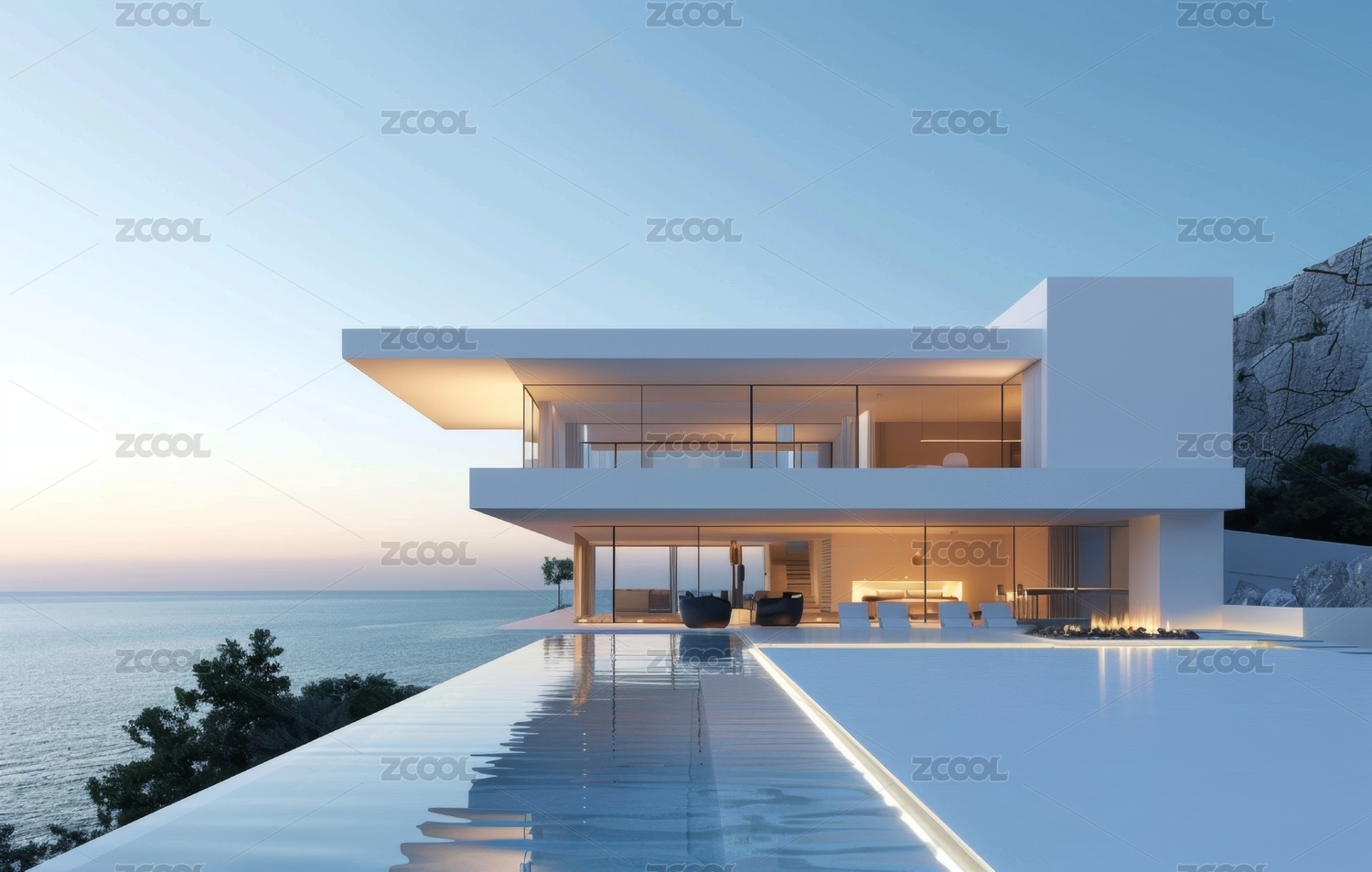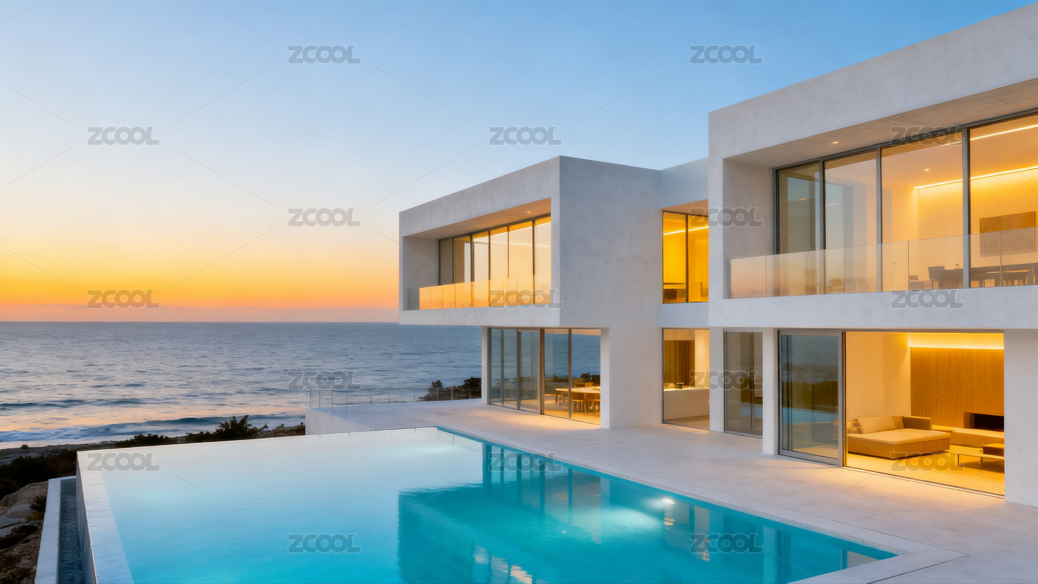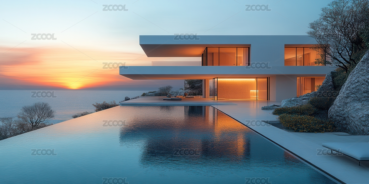 夕阳下的别墅海边现代建筑内部景观无边泳池