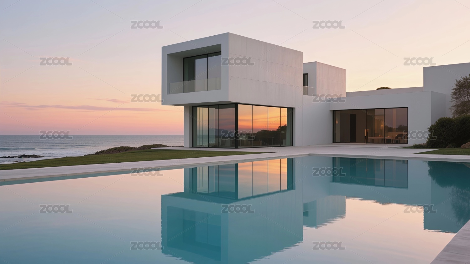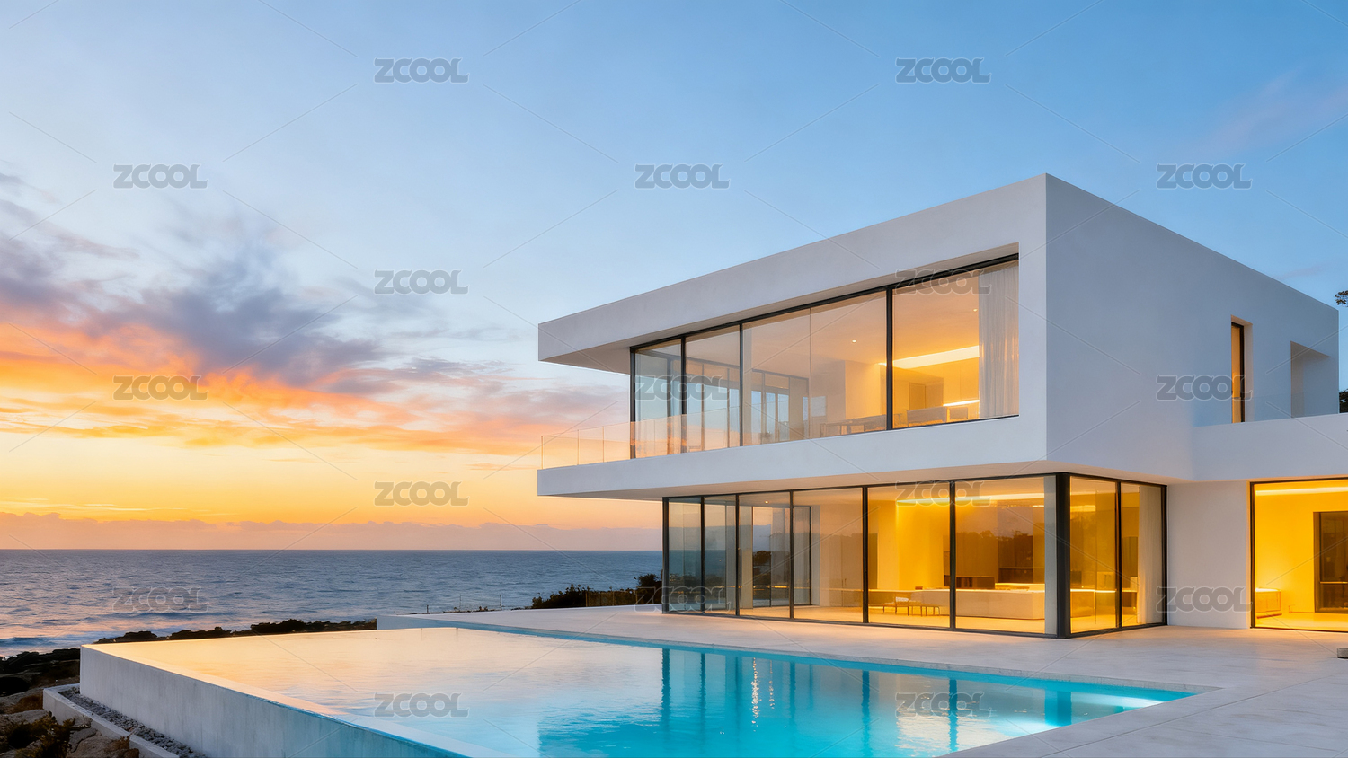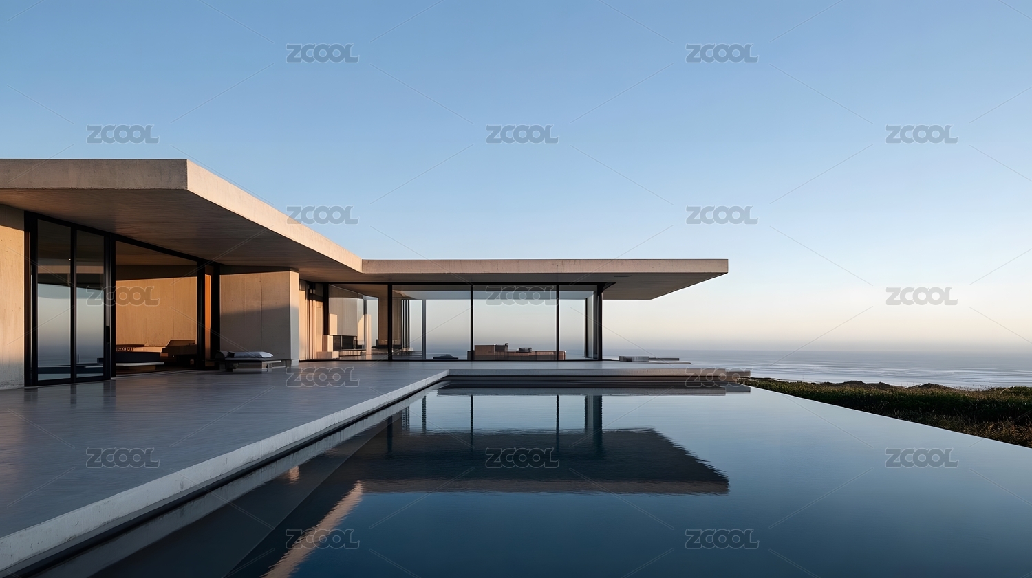 夕阳下的别墅海边现代建筑内部景观无边泳池