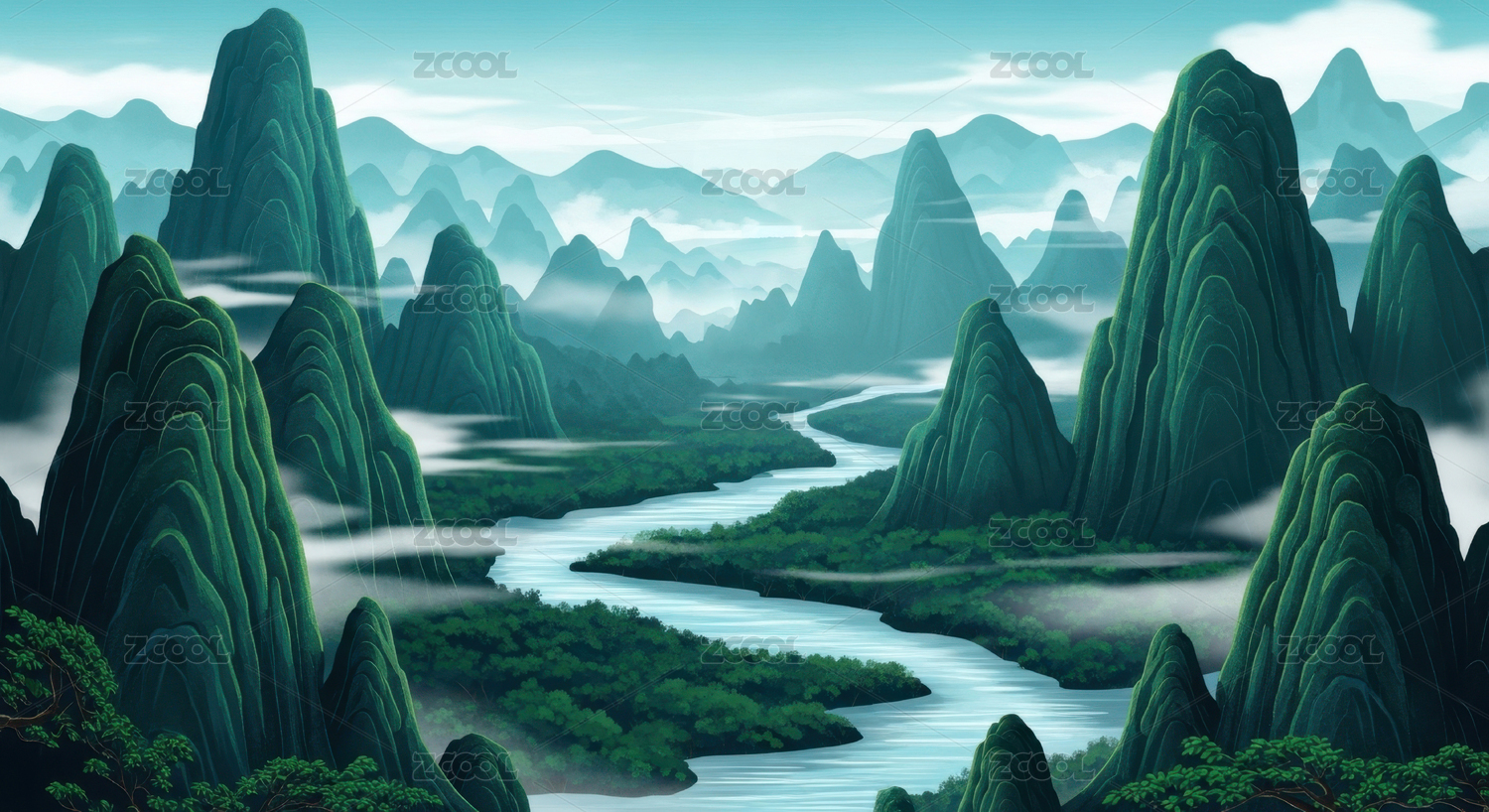 青山绿水云雾缭绕的山水画卷