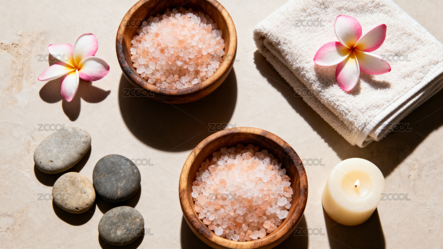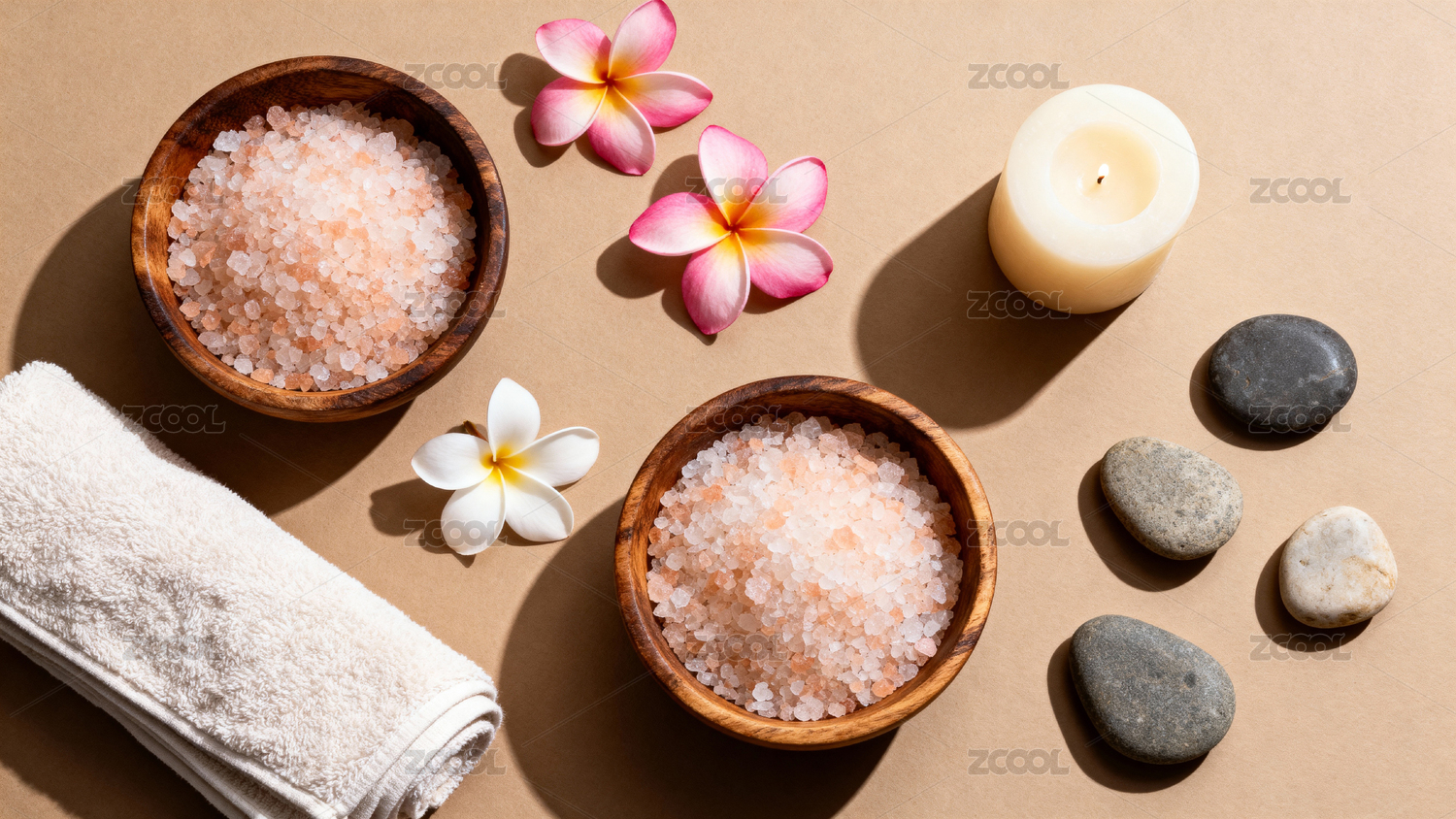 木质碗装盐与毛巾蜡烛摆拍