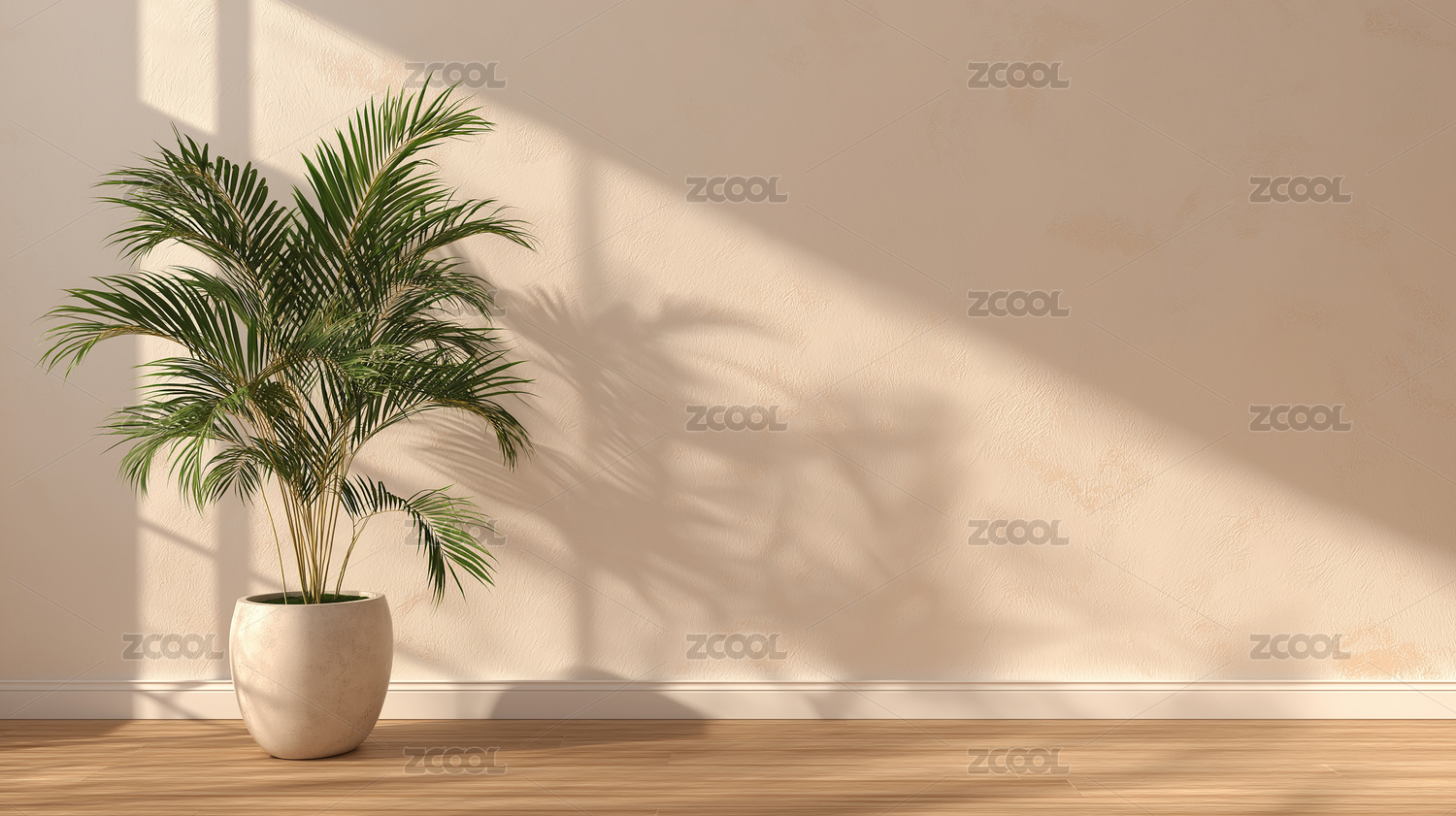 室内浅色墙旁盆栽植物与光影