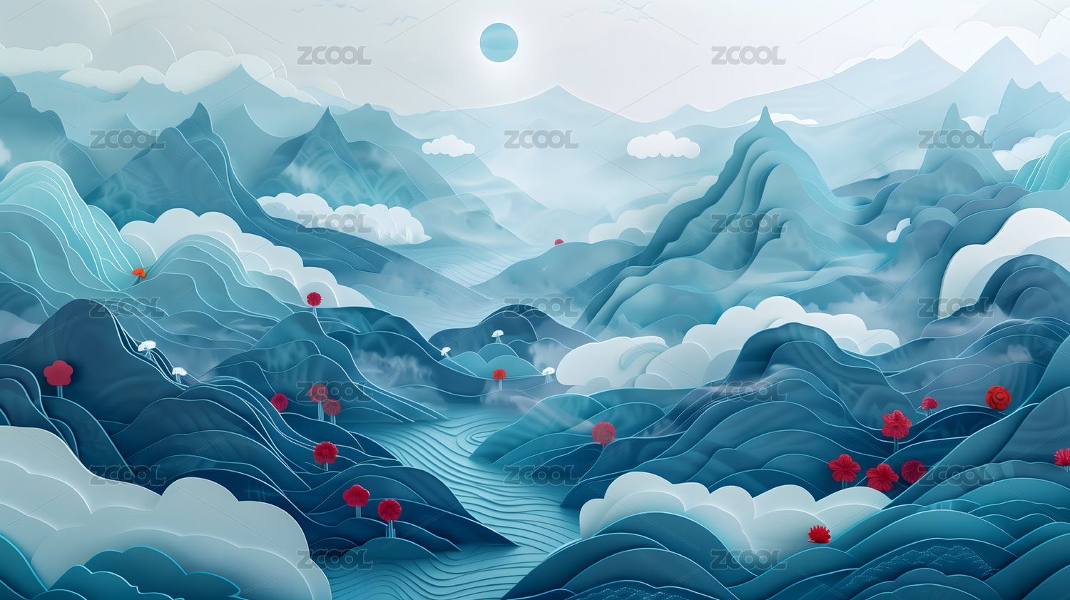 中国风三维纸质感层次感蓝色青色山水