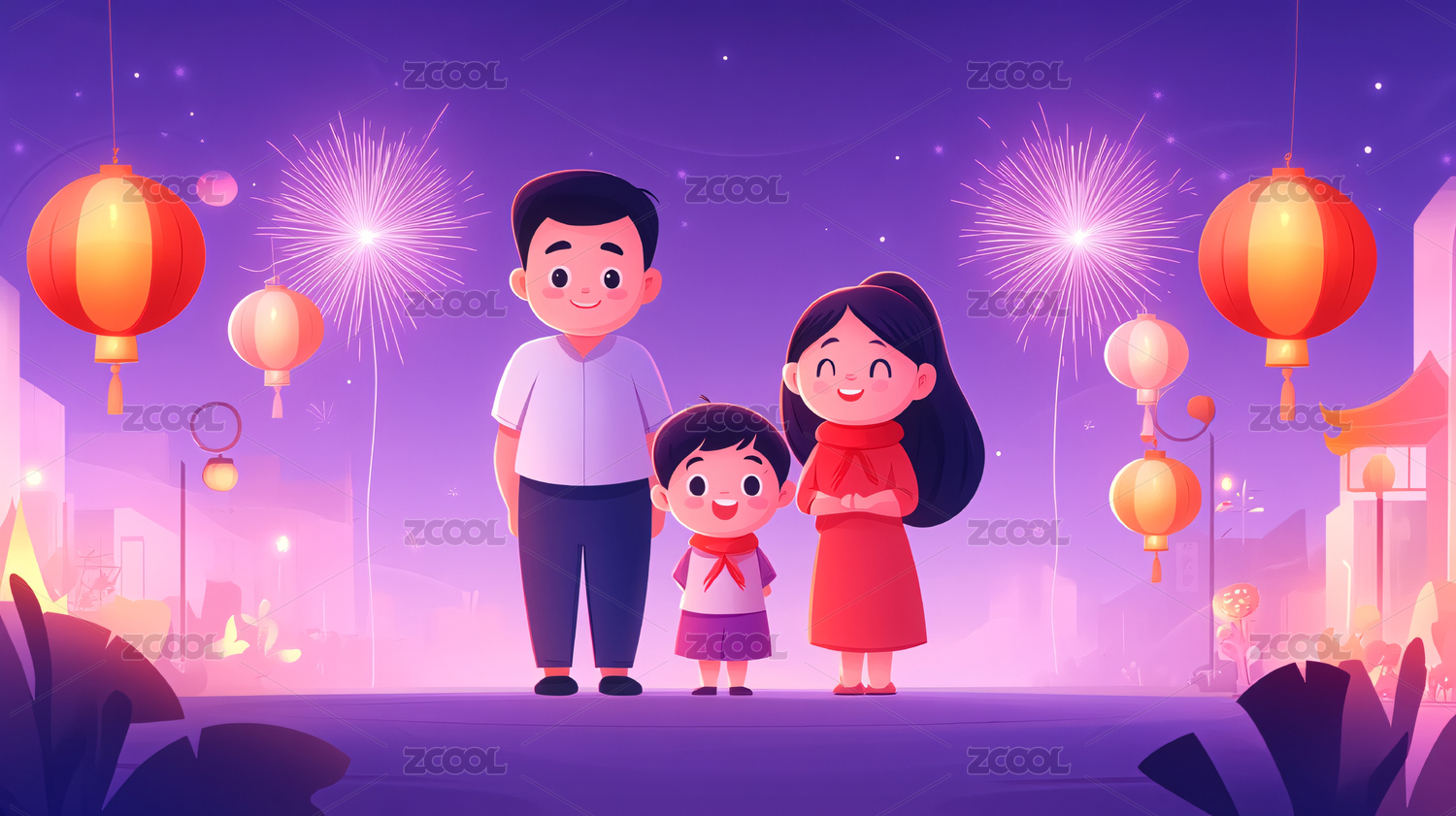 夜市灯笼烟花下的家庭团聚