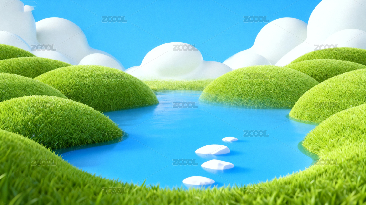 草坪,蓝天,草地,草原,插画,草,绿色,蓝色,云