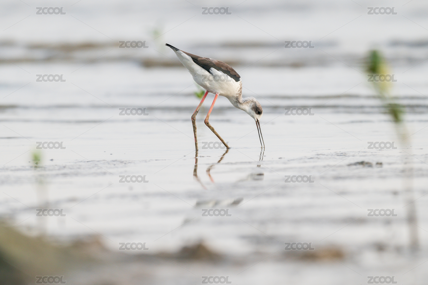 深圳湾公园滩涂上觅食的黑翅长脚鹬