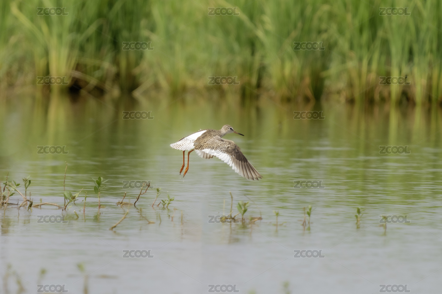 红脚鹬在沼泽地里飞来飞去搜寻觅食