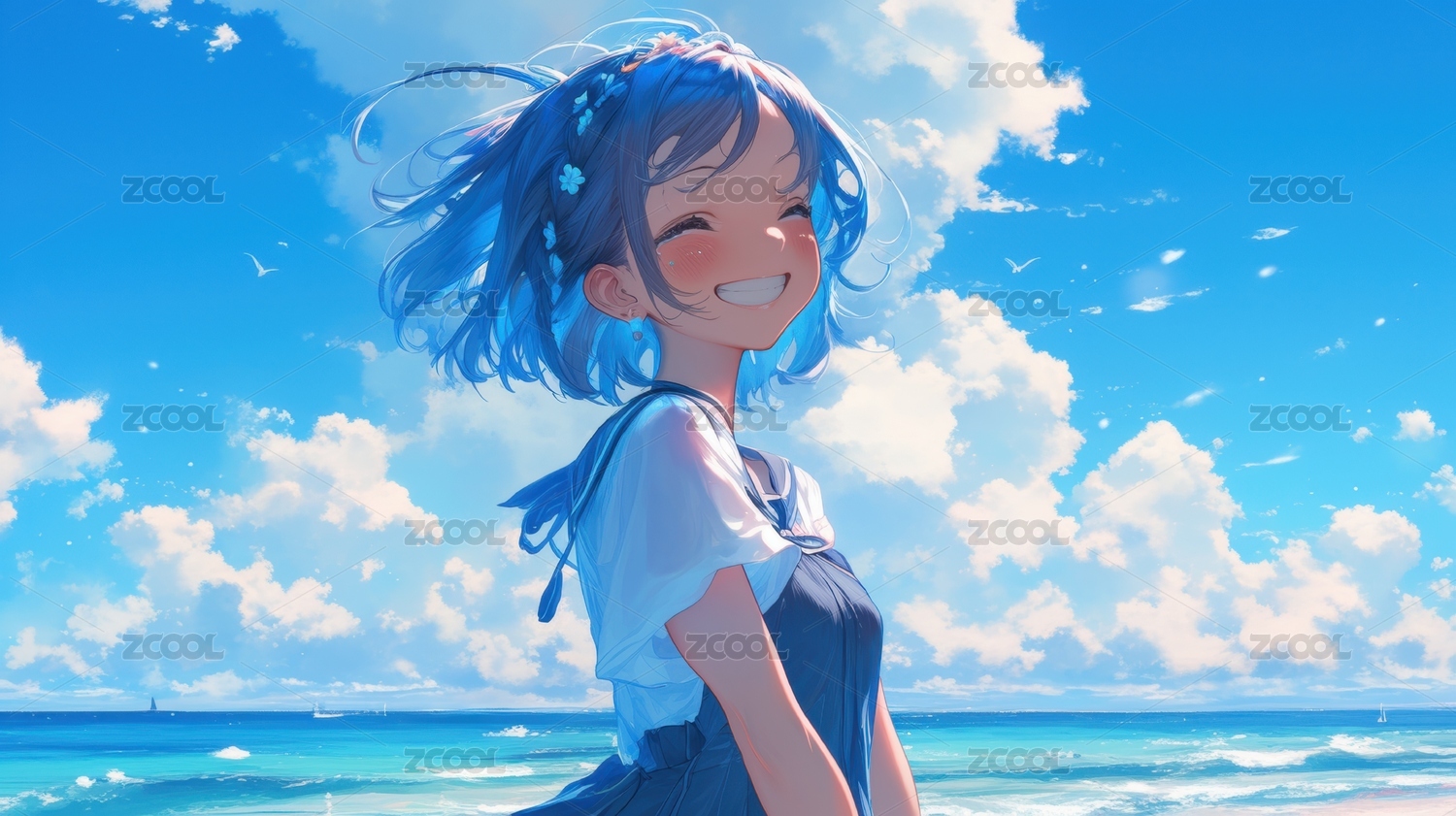 黑发,少女,蓝天,清新,动漫,风姿,裙摆,笑容,自然,活力