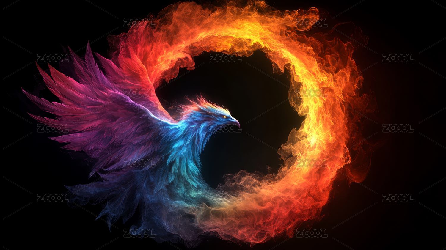 多彩,凤凰,环形,光芒,黑色,背景,传说,生物,艺术,翱翔