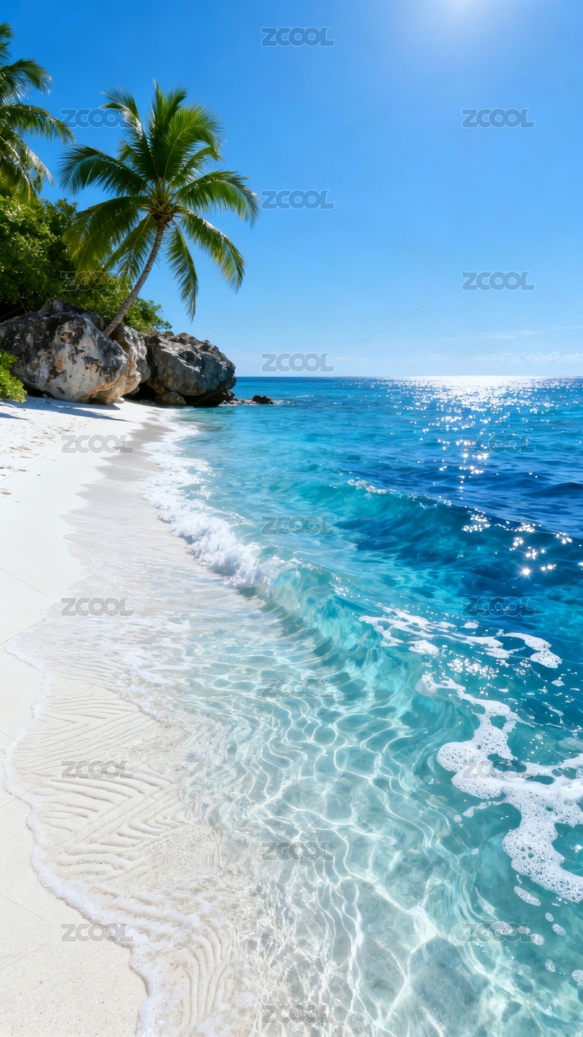 碧海金沙椰林美景,波光粼粼,梦幻海滩