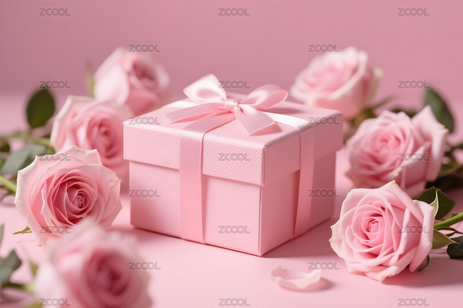 优雅设计,室内摆设,浪漫氛围,粉色玫瑰,柔和色调,温馨场景,礼物包装,细腻质感,梦幻风格,丝带装饰