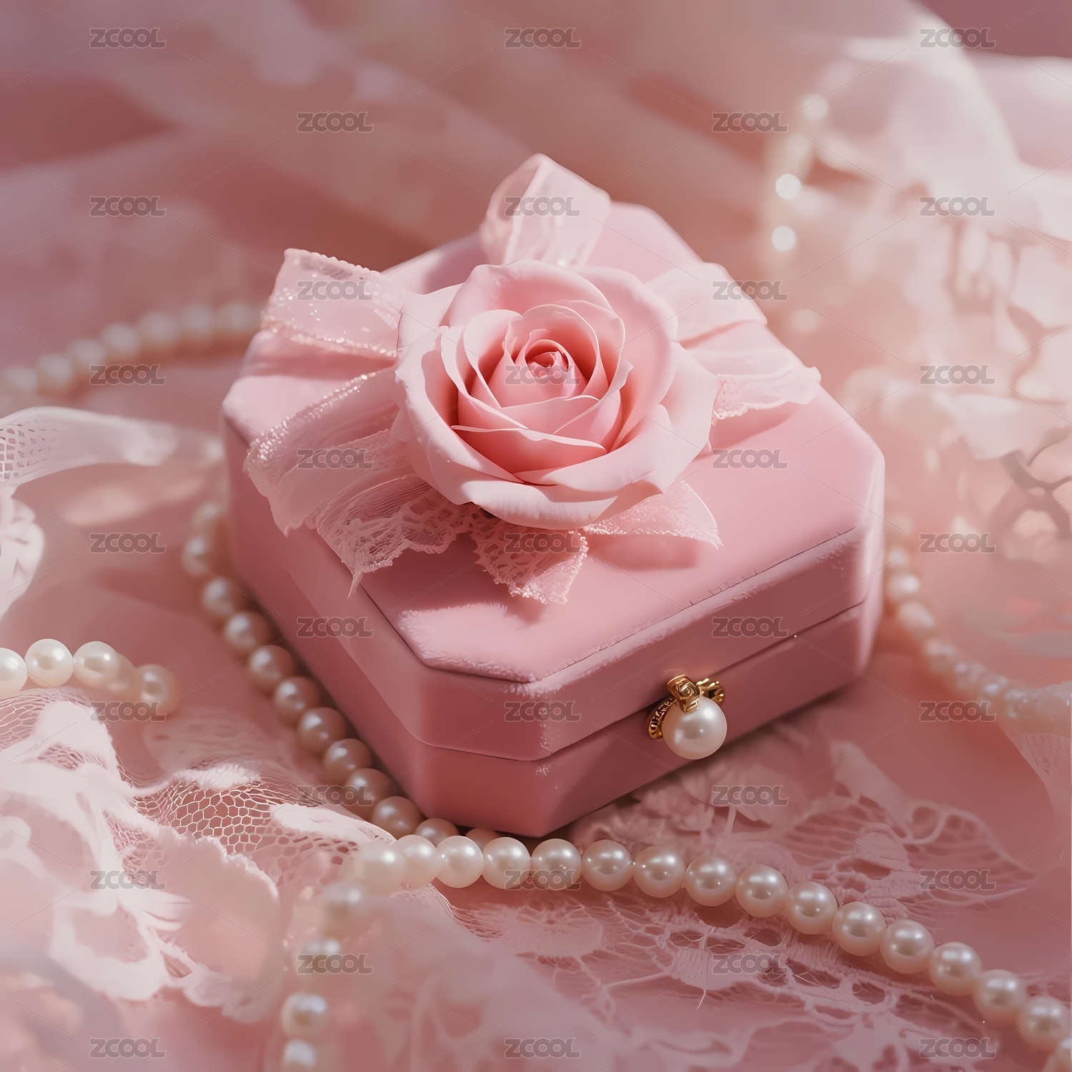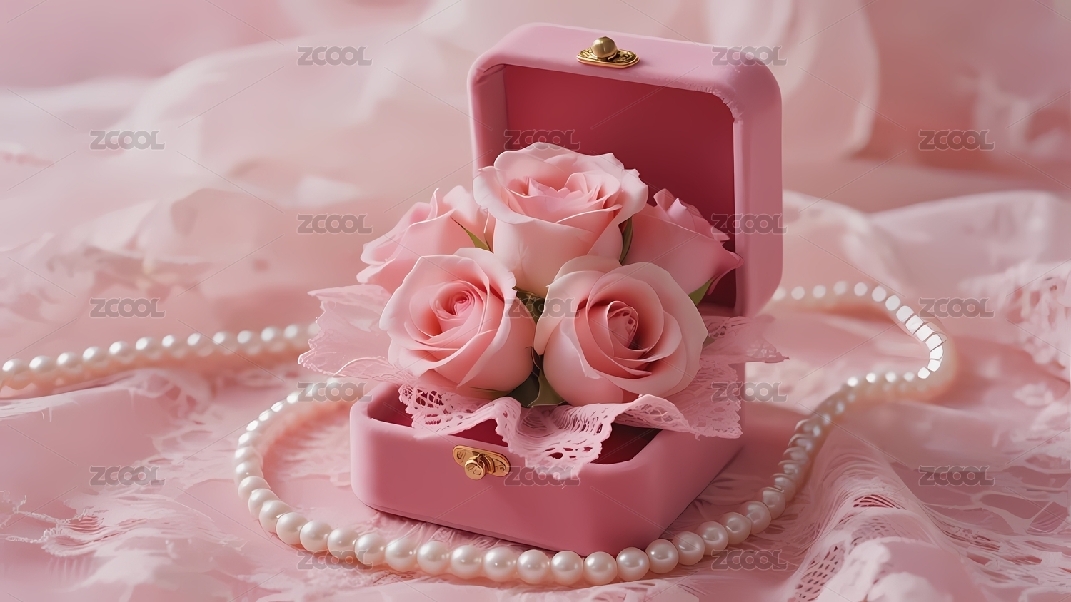 粉色珠宝盒中的玫瑰花与珍珠项链